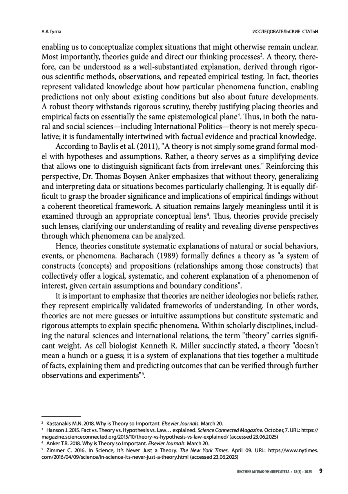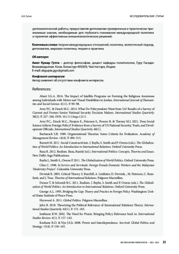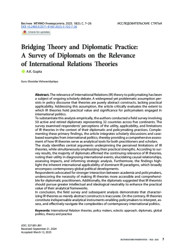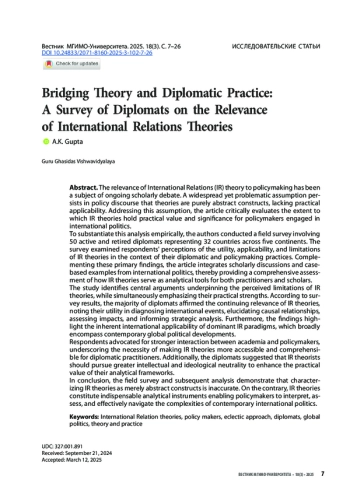 ГУПТА А. К. ПРЕОДОЛЕНИЕ РАЗРЫВА МЕЖДУ ТЕОРИЕЙ И ДИПЛОМАТИЧЕСКОЙ ПРАКТИКОЙ: ОПРОС ДИПЛОМАТОВ О ЗНАЧИМОСТИ ТЕОРИЙ МЕЖДУНАРОДНЫХ ОТНОШЕНИЙ // ВЕСТНИК МГИМО-УНИВЕРСИТЕТА. 2025. ТОМ 18, № 3