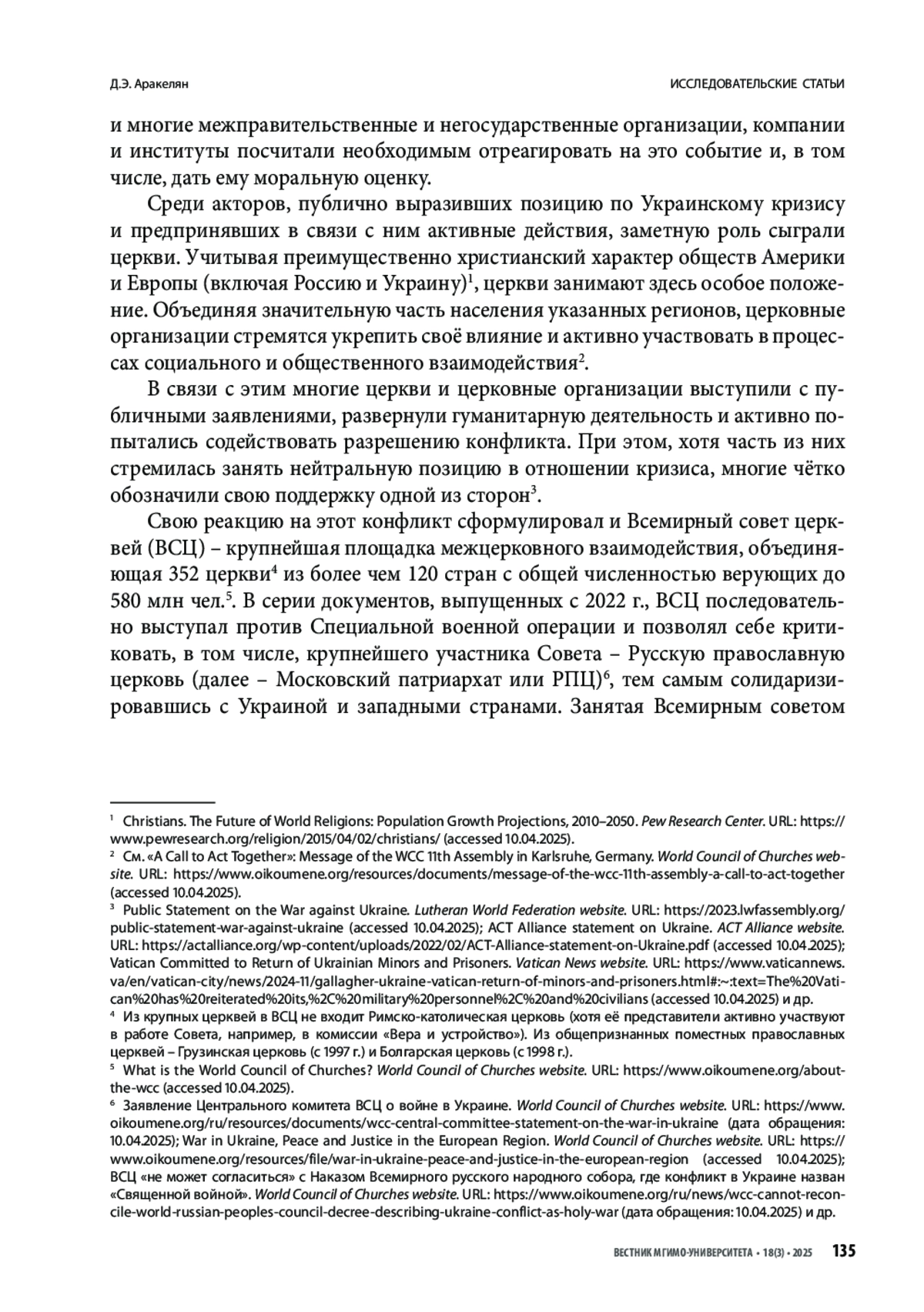 17. Звонарёв С.Л. 2025. Вступление Русской православной церкви во Всемирный совет церквей в контексте церковно-государственных отношений в СССР. Вестник ПСТГУ. №122. С. 164-180. https://doi.org/10.15382/sturII2025122.164-180