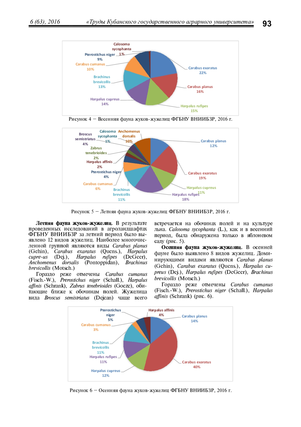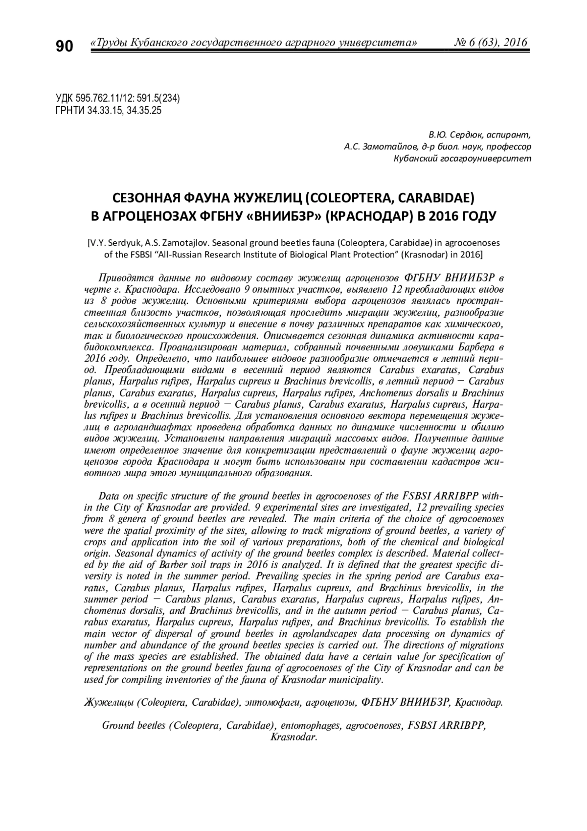 Приводятся данные по видовому составу жужелиц агроценозов ФГБНУ ВНИИБЗР в черте г. Краснодара. Исследовано 9 опытных участков, выявлено 12 преобладающих видов из 8 родов жужелиц. Основными критериями выбора агроценозов являлась пространственная близость участков, позволяющая проследить миграции жужелиц, разнообразие сельскохозяйственных культур и внесение в почву различных препаратов как химического, так и биологического происхождения. Описывается сезонная динамика активности карабидокомплекса. Проанализирован материал, собранный почвенными ловушками Барбера в 2016 году. Определено, что наибольшее видовое разнообразие отмечается в летний период. Преобладающими видами в весенний период являются Carabus exaratus, Carabus planus, Harpalus rufipes, Harpalus cupreus и Brachinus brevicollis, в летний период - Carabus planus, Carabus exaratus, Harpalus cupreus, Harpalus rufipes, Anchomenus dorsalis и Brachinus brevicollis, а в осенний период - Carabus planus, Carabus exaratus, Harpalus cupreus, Harpalus rufipes и Brachinus brevicollis. Для установления основного вектора перемещения жужелиц в агроландшафтах проведена обработка данных по динамике численности и обилию видов жужелиц. Установлены направления миграций массовых видов. Полученные данные имеют определенное значение для конкретизации представлений о фауне жужелиц агроценозов города Краснодара и могут быть использованы при составлении кадастров животного мира этого муниципального образования.