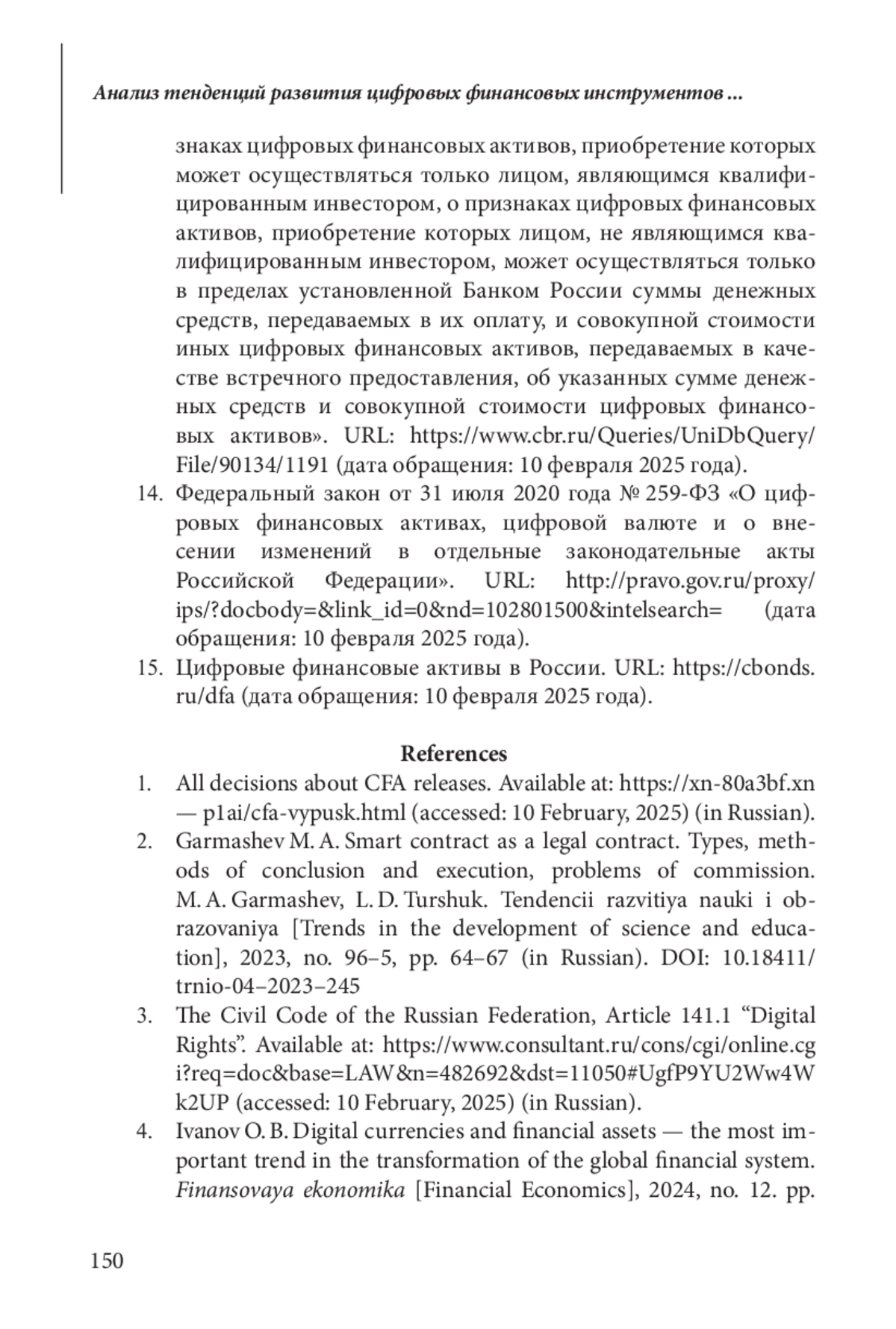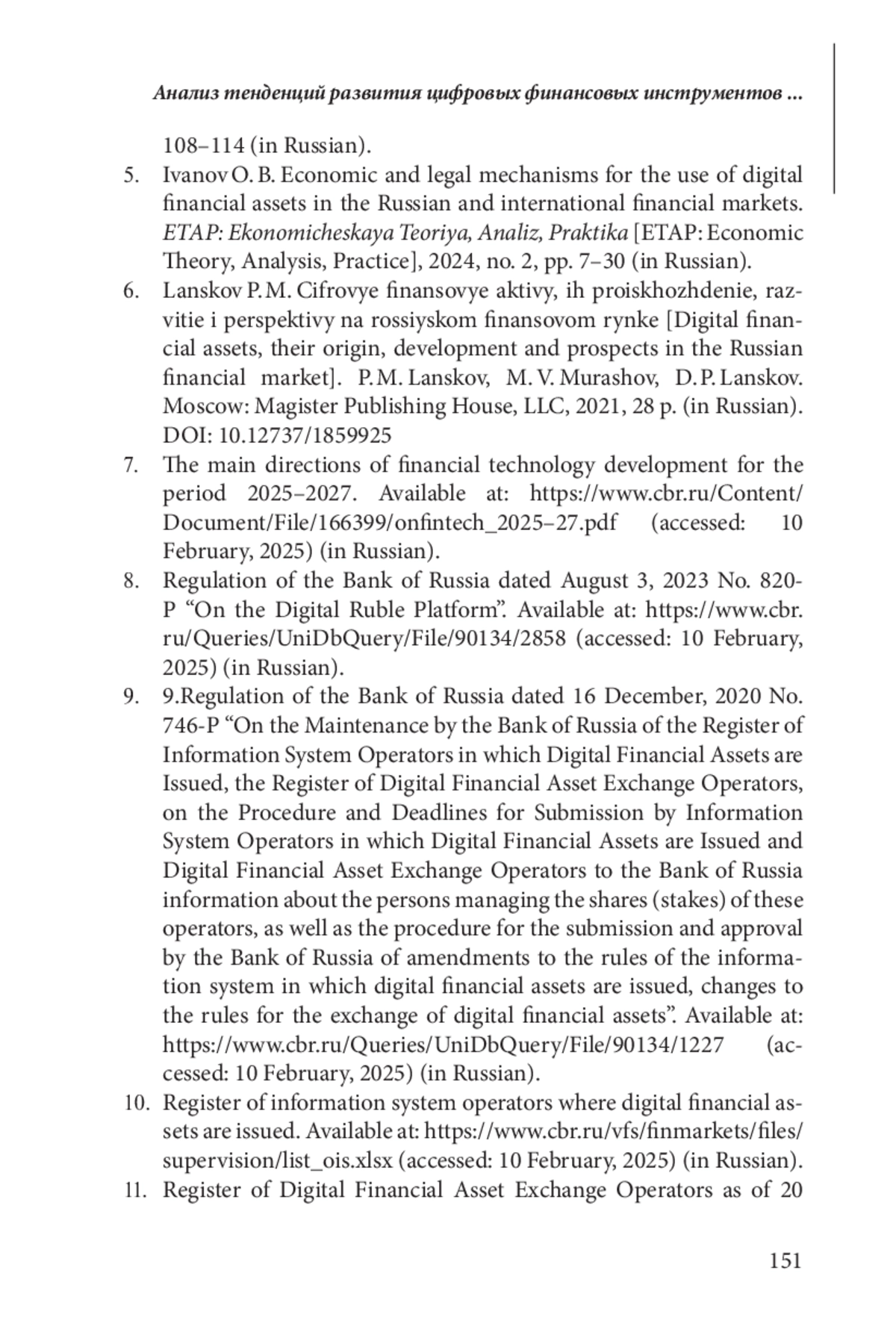 5. Иванов О. Б. Экономико-правовые механизмы применения цифровых финансовых активов на российском и международном финансовых рынках // ЭТАП: Экономическая Теория, Анализ, Практика. 2024. № 2. С. 7-30.