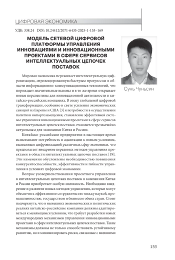 Мировая экономика переживает интеллектуальную цифровизацию, спровоцированную быстрым прогрессом в области информационно-коммуникационных технологий, что порождает значительные вызовы и в то же время открывает новые перспективы для инновационной деятельности в китайско-российских компаниях. В эпоху глобальной цифровой трансформации, особенно в свете усиления экономических санкций из Европы и США [3] и потребности в осуществлении политики импортозамещения, становление эффективной системы управления инновационными проектами в сфере сервисов интеллектуальных цепочек поставок становится чрезвычайно актуальным для экономики Китая и России.