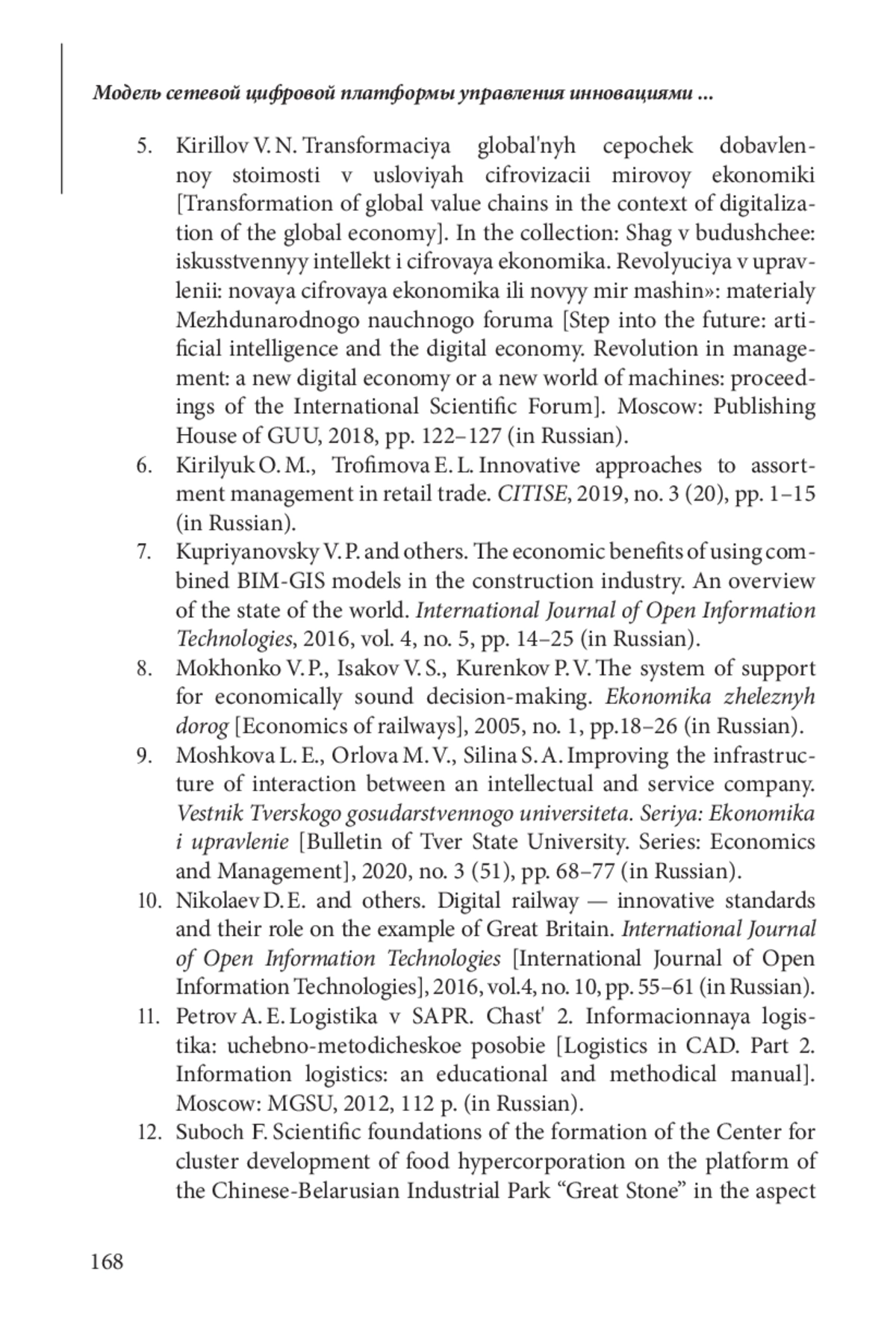 5. Кириллов В. Н. Трансформация глобальных цепочек добавленной стоимости в условиях цифровизации мировой экономики // В сб.: “Шаг в будущее: искусственный интеллект и цифровая экономика. Революция в управлении: новая цифровая экономика или новый мир машин”: материалы Международного научного форума. М.: Изд. дом ГУУ, 2018. С. 122-127.