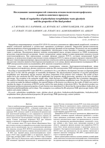 27. Abduvokhidov I.K., Juraev A.B., Alimukhamedov M.G., Adilov R.I. Research of the product obtained as a result of the depolymerization of secondary polyethyleneterefthalate with ethyleneglycol // Scientifi c and Technical Journal of Namangan Instituti of Engineering and Technology. Namangan. 2022. Vol. 7. Issue 4. Р. 164-176.