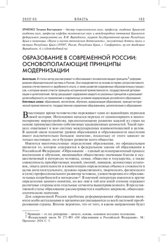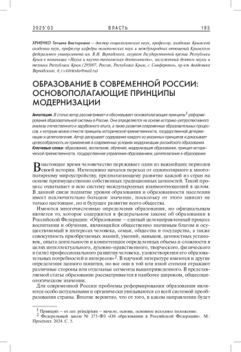 В статье автор рассматривает и обосновывает основополагающие принципы реформирования образовательной системы в России. Они определяются на основе историко-ретроспективного анализа отечественного и зарубежного опыта, а также развития современных образовательных процессов, к которым можно отнести принципы исторической преемственности, государственной детерминации и целеполагания. Автор раскрывает содержание каждого из указанных принципов и доказывает целесообразность их применения в современных условиях модернизации российского образования.