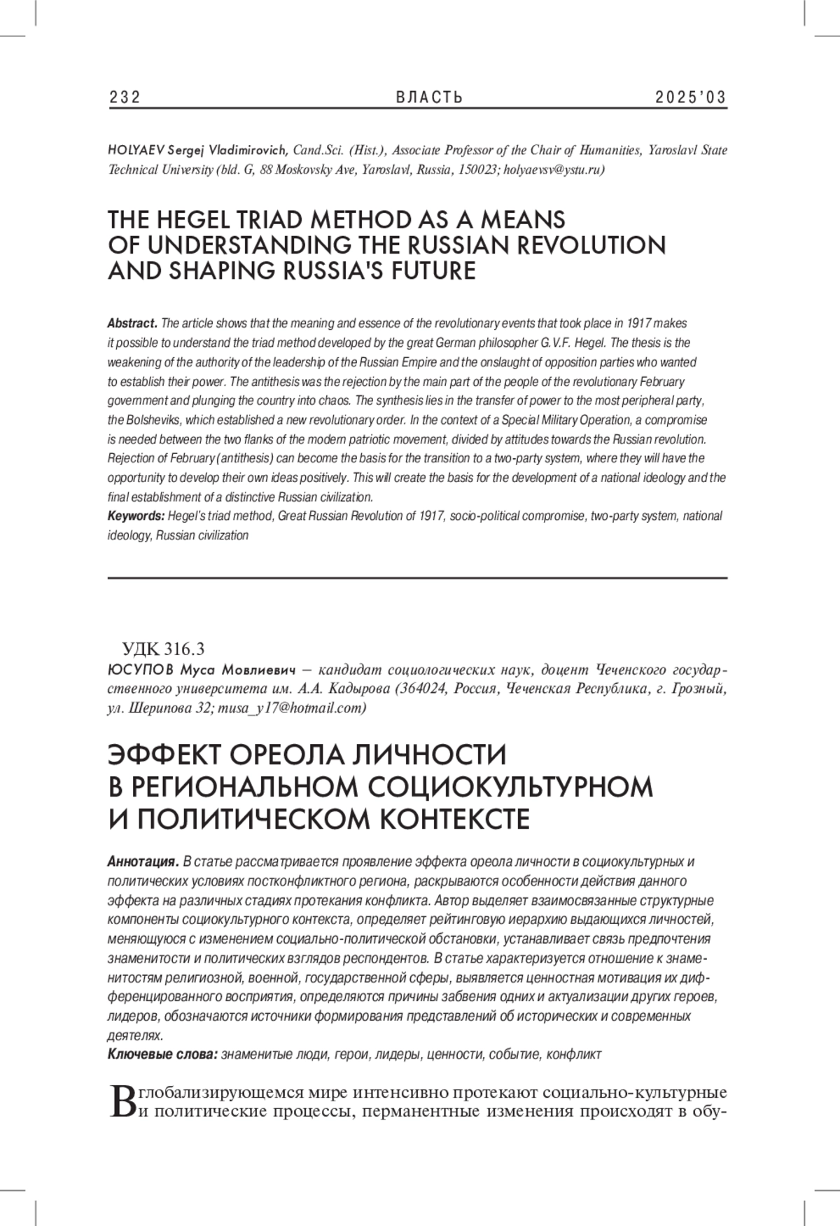 В статье автор показывает, что смысл и суть происходивших в 1917 г. революционных событий позволяет понять метод триады, разработанный великим немецким философом Г. В. Ф. Гегелем. Тезисом является ослабление авторитета руководства Российской империи и натиск на него оппозиционных партий, желавших установить свою власть. Антитезисом стало неприятие основной частью народа революционной февральской власти и погружение страны в хаос. Синтез заключается в переходе власти к самой периферийной партии - большевикам, установившим новый революционный порядок. В условиях специальной военной операции необходим компромисс между двумя флангами современного патриотического движения, разделенными отношением к российской революции. Неприятие Февраля (антитезис) способно стать основой для перехода к двухпартийной системе, где будет возможность положительного развития собственных идей. Это создаст основу для выработки общенациональной идеологии и окончательного утверждения самобытной русской цивилизации.
