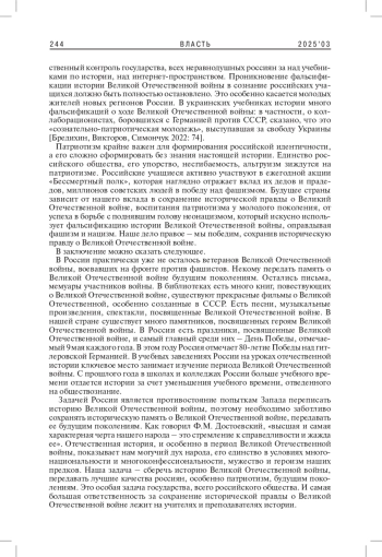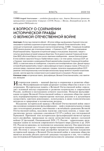 ГУЛЯЕВ А. А. К ВОПРОСУ О СОХРАНЕНИИ ИСТОРИЧЕСКОЙ ПРАВДЫ О ВЕЛИКОЙ ОТЕЧЕСТВЕННОЙ ВОЙНЕ // ВЛАСТЬ. 2025. ТОМ 33 № 3