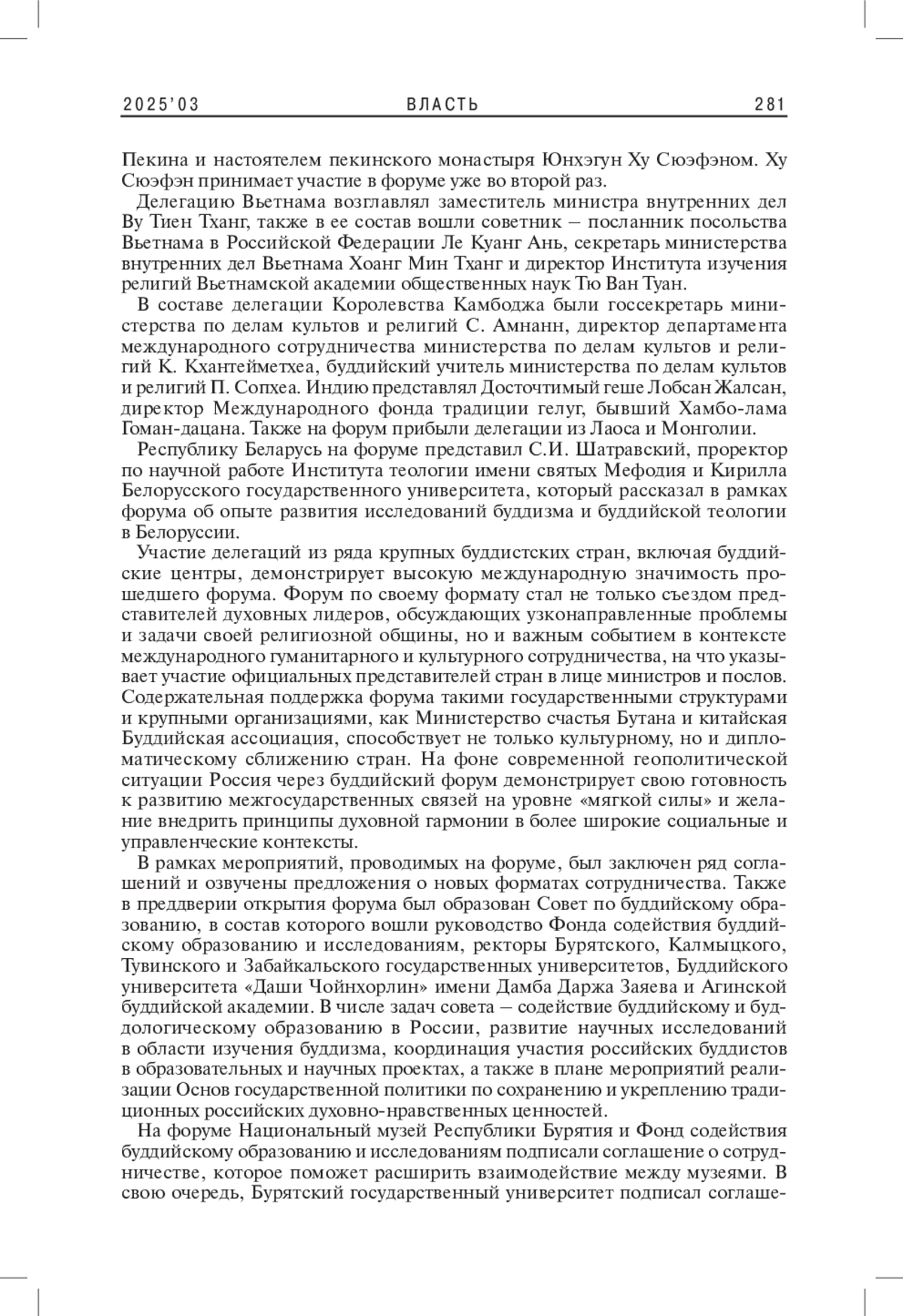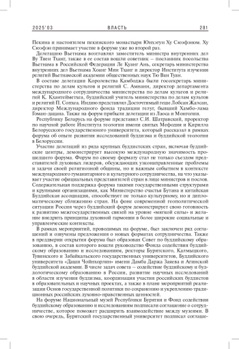 ДАВЛЕТШИНА Д. А., СУКИАСЯНЦ Н. Н. II МЕЖДУНАРОДНЫЙ БУДДИЙСКИЙ ФОРУМ: ТЕМА СОХРАНЕНИЯ И УКРЕПЛЕНИЯ ТРАДИЦИОННЫХ ЦЕННОСТЕЙ В МЕЖДУНАРОДНОЙ КОММУНИКАЦИИ // ВЛАСТЬ. 2025. ТОМ 33 № 3