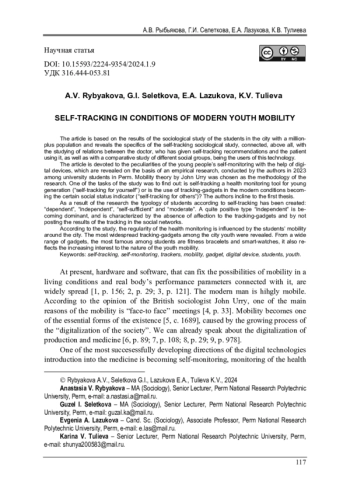 Статья базируется на результатах социологического исследования студенческой молодежи в городе-миллионере и раскрывает специфику социологического исследования селф-трекинга, связанную прежде всего с изучением отношений между врачом, рекомендующим селф-трекинг, и пациентом, использующим его, а также с компаративным анализом различных социальных групп, являющихся потребителем данной технологии. Статья посвящена особенностям самомониторинга молодежи с помощью цифровых устройств, которые раскрываются на основе эмпирического исследования, проведенного авторами в 2023 г. среди студентов вузов г. Перми. В качестве методологии исследования выбрана теория мобильности Дж. Урри. Одной из задач исследования был поиск ответа на вопрос: является ли селф-трекинг для молодого поколения средством диагностики состояния своего здоровья («селф-трекинг для себя»), или потребление трекинг-гаджетов в современных условиях становится показателем определенного социального статуса («селф-трекинг для других»)? Авторы склоняются к первому тезису. В результате исследования была сконструирована собственная типология студентов по селф-трекингу: «зависимые», «независимые», «самодостаточные» и «умеренные», выявлена распространенность представленных типов. Доминирующим становится достаточно благоприятный тип «независимые», характеризующийся отсутствием болезненной привязанности к трекинг-гаджетам и не нацеленный на публичное представление в социальных сетях своих зафиксированных данных. Согласно результатам исследования, на регулярность отслеживания состояния своего здоровья влияет характер перемещений студентов по городу. Были выявлены наиболее распространенные устройства для трекинга среди городской молодежи. Из широкого перечня таких устройств студентам известны в основном фитнес-браслеты, смарт-часы, что также отражает повышенный интерес к характеру мобильности молодежи.