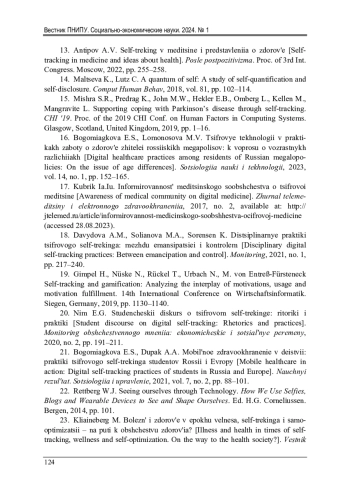 1. Богомягкова Е.С., Дупак А.А. Цифровой селф-трекинг здоровья в дискурсе социальных наук // Социология науки и технологий. - 2021. - № 2. - С. 155-174. EDN: EAHKTO