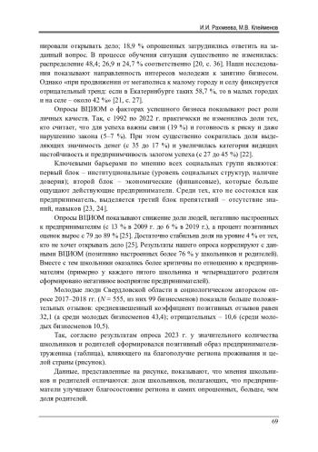 Актуальность исследования установок общества в отношении предпринимательства на современном этапе обусловлена необходимостью преодоления социокультурного кризиса и активации внутренних социальных, институциональных факторов для выхода на траекторию роста. Теоретическим фундаментом исследования служат разного рода социально-экономические концепты, а методическим инструментарием - социологические методы. Цель исследования - выявить и сопоставить образ предпринимателя в глазах общества и характеристики бизнесмена, которые способствуют/препятствуют социально-экономическому развитию. Выводы статьи базируются на результатах социологических исследований, проведенных авторами в 2017-2023 гг. среди представителей российского малого и среднего бизнеса, а также школьников, студентов экономического университета и совершеннолетнего молодого населения Свердловской области. В ходе основного исследования в 2023 г. авторами выявлено позитивное отношение школьников и родителей к занятию бизнесом, что может являться основой для формирования мотивации к становлению молодежи предпринимателями в будущем. Положительное отношение (максимальные 5 баллов) поставили 48,3 % школьников и 70,9 % родителей. При этом крайне негативное отношение (минимальный 1 балл) указали 22,6 % школьников и 9,9 % родителей. Говоря об образе бизнесмена, то 34,3 % школьников и 51,6 % родителей считают, что предприниматель - это труженик. Если говорим о бизнесмене как ловкаче, изворотливом человеке, то так считает 22,6 % школьников против 9,9 % родителей. И результаты прошлых социологических исследований социологической лаборатории УрГЭУ показали, что позитивный образ предпринимателя прочно укоренился среди молодых людей 18-30 лет, молодых предпринимателей и представителей малого и среднего бизнеса.