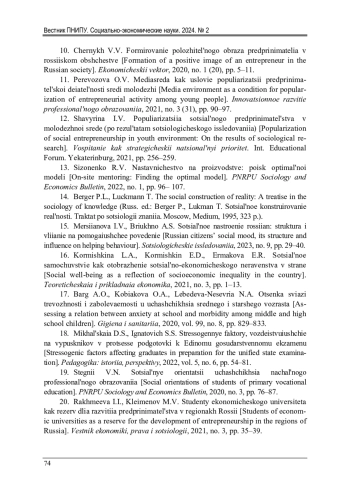 2. Бахтин, Е.Л. Нестабильность как новая норма занятости молодежи / Е.Л. Бахтин // Уральский социологический форум к 100-летию Л.Н. Когана: Культура, личность, общество в условиях перемен: новые вызовы, проблемы, перспективы: материалы XХVI Междунар. конф. памяти проф. Л.Н. Когана. - Екатеринбург, 2023. - С. 184-197. EDN: JJJXPX