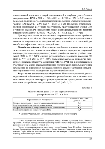 Уровень детско-подростковой заболеваемости, связанной с употреблением психоактивных веществ (ПАВ), всплеск летальных исходов, вызванных токсическими отравлениями, а также рост отдельных показателей, связанных с употреблением ненаркотических ПАВ, в Российской Федерации актуализируют анализ современного состояния проблемы токсикомании в стране. В статье представлены данные вторичного анализа материалов опросов трудоспособного городского населения РФ (2019 г., N = 1350; 2021 г., N = 1355) и студентов российских высших учебных заведений (2021 г., N = 528), проведенных сектором социологии девиантного поведения Института социологии ФНИСЦ РАН при непосредственном участии автора. Осуществлен обзор специализированных статистических данных и содержания сегмента сети интернет, посвященного изучаемой проблематике. Рассмотрены два наиболее распространенных на сегодняшний день вида токсикомании: газовая (т. н. «сниффинг») и употребление лекарственных препаратов в немедицинских целях. Произведен обзор осуществляемых мер по противодействию токсикомании. Выявлено, что наиболее остро рассматриваемая проблема стоит среди подросткового населения, что обусловлено такими факторами, как латентный характер приема токсических веществ ввиду практически полного отсутствия внешних признаков употребления; широкая доступность приобретения товаров, распространенных в использовании для достижения токсического опьянения, их относительно невысокая стоимость, а также легальный оборот.