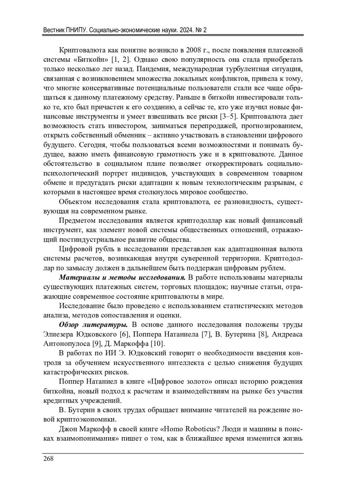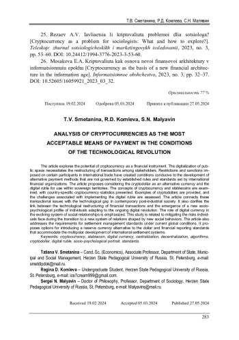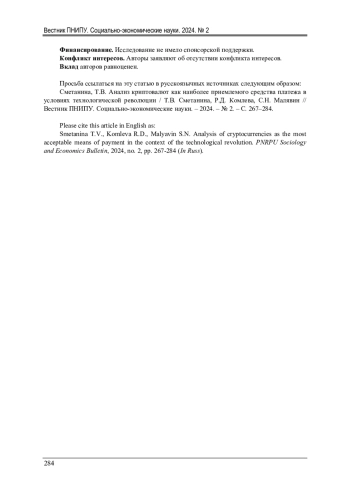 СМЕТАНИНА Т. В., КОМЛЕВА Р. Д., МАЛЯВИН С. Н. АНАЛИЗ КРИПТОВАЛЮТ КАК НАИБОЛЕЕ ПРИЕМЛЕМОГО СРЕДСТВА ПЛАТЕЖА В УСЛОВИЯХ ТЕХНОЛОГИЧЕСКОЙ РЕВОЛЮЦИИ // ВЕСТНИК ПЕРМСКОГО НАЦИОНАЛЬНОГО ИССЛЕДОВАТЕЛЬСКОГО ПОЛИТЕХНИЧЕСКОГО УНИВЕРСИТЕТА. СОЦИАЛЬНО-ЭКОНОМИЧЕСКИЕ НАУКИ. 2024. № 2