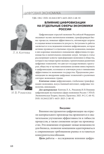 Цифровизация отраслей экономки Российской Федерации оказывает на них значительное влияние, трансформируя бизнес-процессы, повышая эффективность, оптимизируя затраты и создавая новые возможности для роста. Актуальность работы заключается в исследовании влияния цифровизации, которая активно проникает в отдельные отрасли экономики, вызывая в них коренные изменения в повышении эффективности производства и значительном снижении затрат. Авторы в статье рассматривают аспекты трансформации экономики и общества, которая в настоящее время вызвана стремительным развитием цифровых технологий, что диктует государственным структурам, обществу и частным компаниям активно инвестировать в цифровизацию, осознавая ее ключевую роль в повышении эффективности экономики государства. Предложены рекомендации по внедрению цифровых технологий в различных секторах экономики страны.