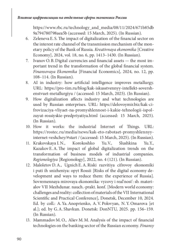 6. Зеленева Е. С. Влияние цифровизации финансовой сферы на процентный канал трансмиссионного механизма денежно-кредитной политики Банка России // Креативная экономика. 2024. Том 18, № 6. С. 1413-1430.