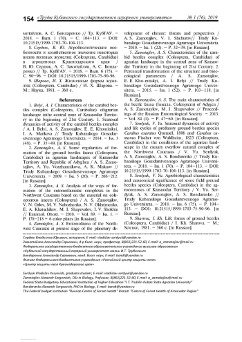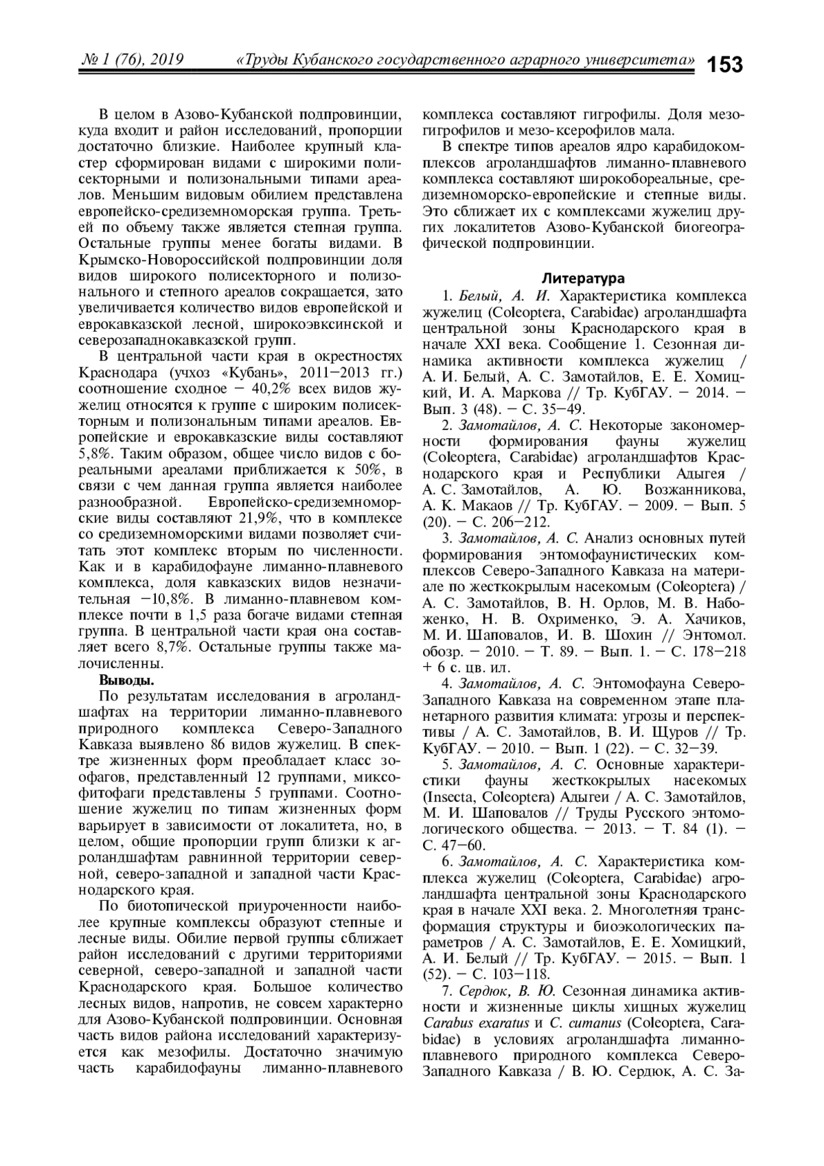 Статья: Жизненные формы, экологическая приуроченность и ареалогическая характеристика жужелиц (Coleoptera, Carabidae) агроландшафта в условиях лиманно-плавневого природного комплекса северо-Западного Кавказа (2019)
