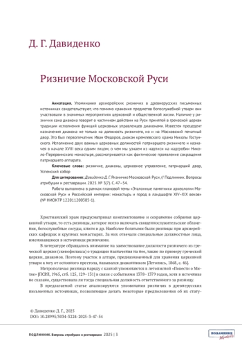 Упоминания архиерейских ризничих в древнерусских письменных источниках свидетельствуют, что помимо хранения предметов богослужебной утвари они участвовали в значимых мероприятиях церковной и общественной жизни. Наличие у ризничих сана диакона говорит о частичном действии на Руси принятой в греческой церкви традиции исполнения функций церковных управленцев диаконами. Известен прецедент назначения диакона не только на должность ризничего, но и на Московский печатный двор. Это был первопечатник Иван Федоров, диакон кремлевского храма Николы Гостунского. Исполнение двух важных церковных должностей патриаршего ризничего и казначея в начале XVIII века одним лицом, о чем мы узнаем из надписи на надгробии Николо-Перервинского монастыря, рассматривается как фактическое проявление сокращения патриаршего аппарата.