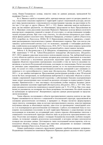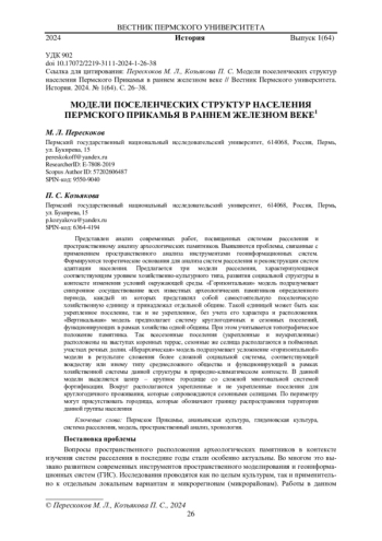 22. Перескоков М.Л. Новые данные о расселении и адаптации населения Пермского Прикамья в финале раннего железного века (методы пространственного анализа) // Человек и Север: антропология, археология, экология: материалы всерос. науч. конф., Тюмень, 2-6 апреля 2018 г. Тюмень, 2018а. Вып. 4. С. 177-180. EDN: YVHFMH