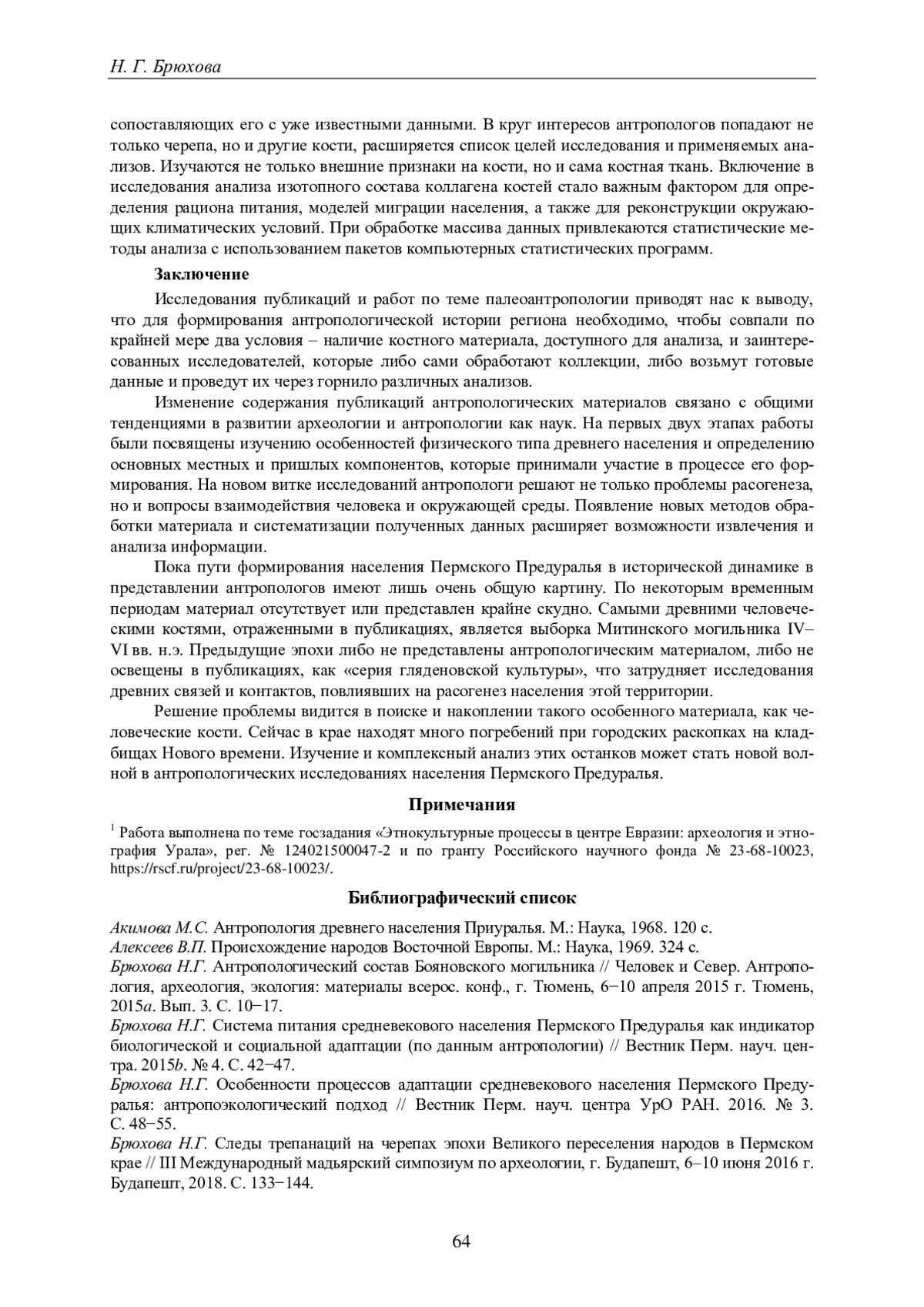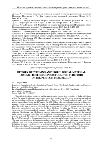 БРЮХОВА Н. Г. ИСТОРИЯ ИЗУЧЕНИЯ АНТРОПОЛОГИЧЕСКОГО МАТЕРИАЛА, ПРОИСХОДЯЩЕГО ИЗ НЕКРОПОЛЕЙ С ТЕРРИТОРИИ ПЕРМСКОГО ПРЕДУРАЛЬЯ // ВЕСТНИК ПЕРМСКОГО УНИВЕРСИТЕТА. ИСТОРИЯ. 2024. № 1 (64)