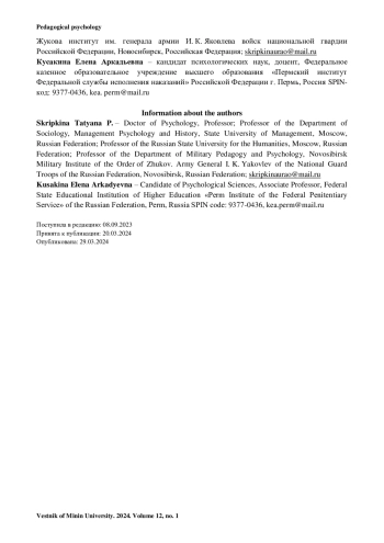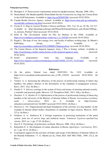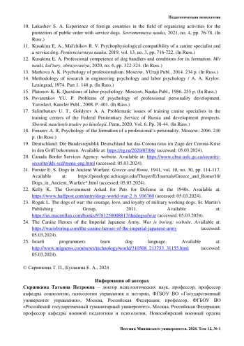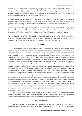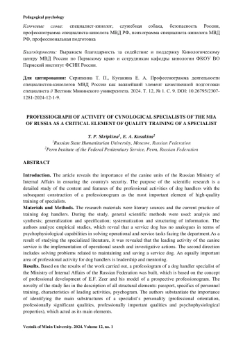 СКРИПКИНА Т. П., КУСАКИНА Е. А. ПРОФЕССИОГРАММА ДЕЯТЕЛЬНОСТИ СПЕЦИАЛИСТОВ-КИНОЛОГОВ МВД РОССИИ КАК ВАЖНЕЙШИЙ ЭЛЕМЕНТ КАЧЕСТВЕННОЙ ПОДГОТОВКИ СПЕЦИАЛИСТА // ВЕСТНИК МИНИНСКОГО УНИВЕРСИТЕТА. 2024. ТОМ 12, № 1