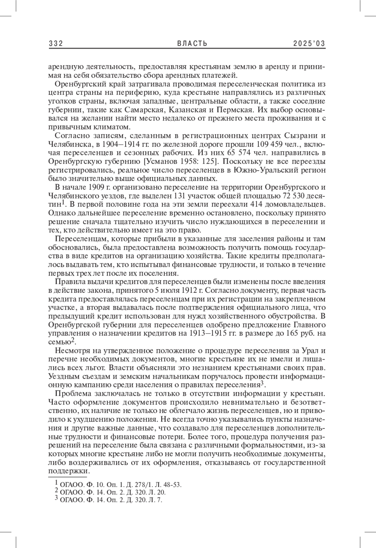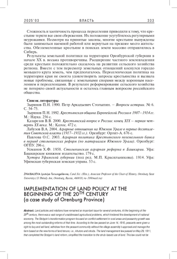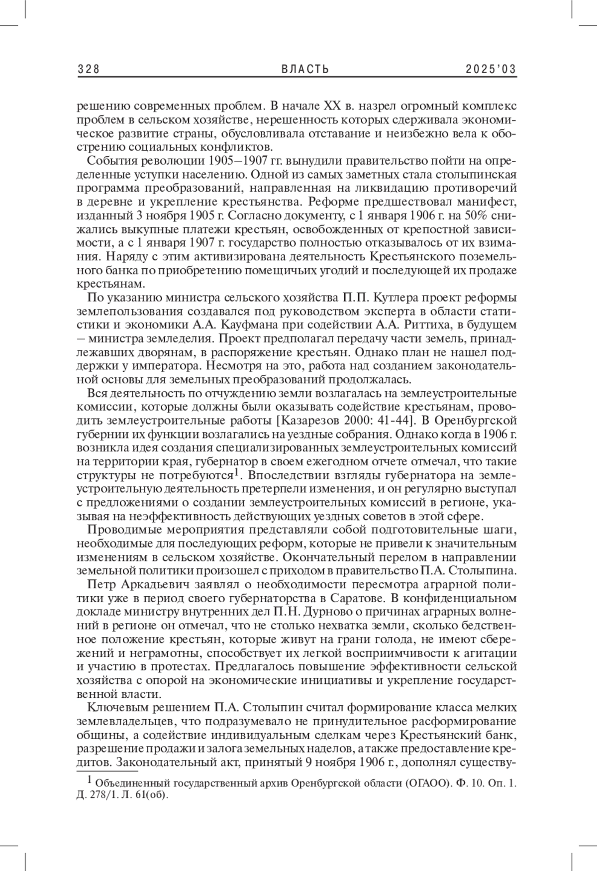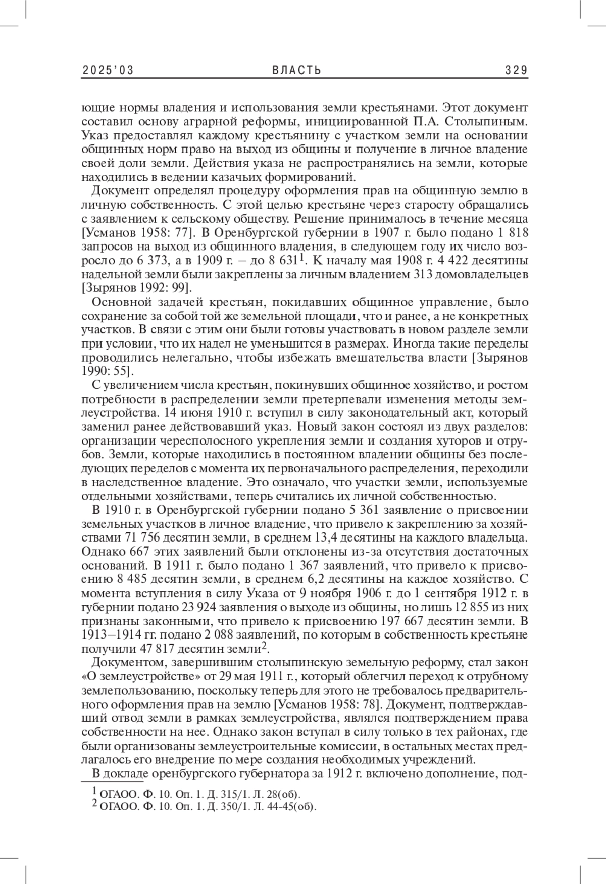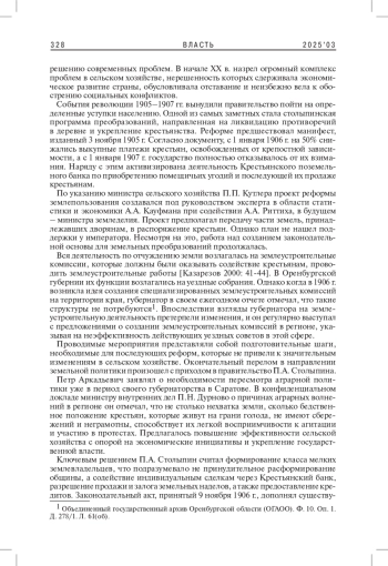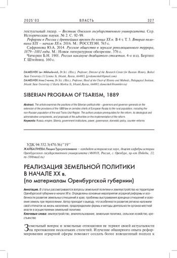 ЖАЙБАЛИЕВА Л. Т. РЕАЛИЗАЦИЯ ЗЕМЕЛЬНОЙ ПОЛИТИКИ В НАЧАЛЕ XX В. (ПО МАТЕРИАЛАМ ОРЕНБУРГСКОЙ ГУБЕРНИИ) // ВЛАСТЬ. 2025. ТОМ 33 № 3