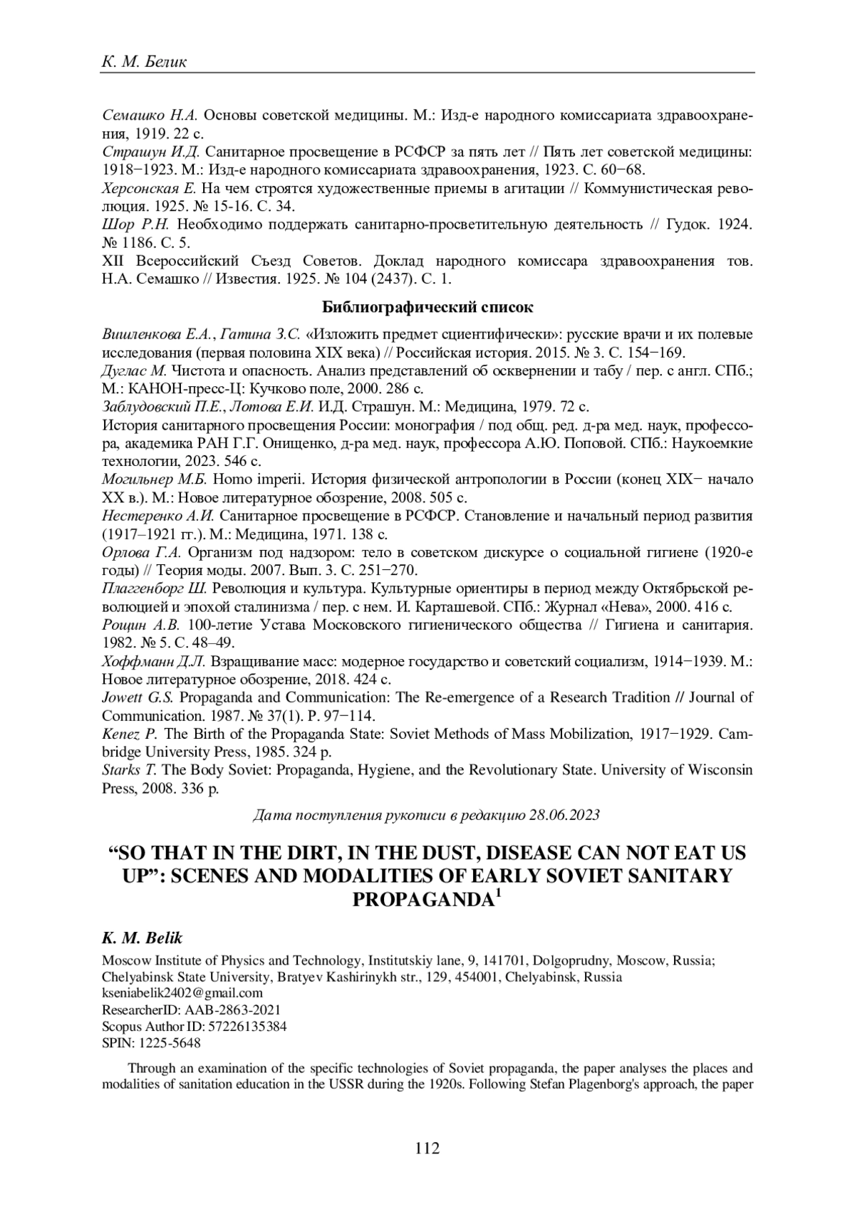 7. Орлова Г.А. Организм под надзором: тело в советском дискурсе о социальной гигиене (1920-е годы) // Теория моды. 2007. Вып. 3. С. 251-270.