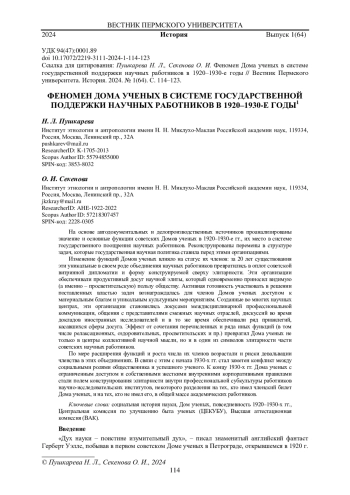 ПУШКАРЕВА Н. Л., СЕКЕНОВА О. И. ФЕНОМЕН ДОМА УЧЕНЫХ В СИСТЕМЕ ГОСУДАРСТВЕННОЙ ПОДДЕРЖКИ НАУЧНЫХ РАБОТНИКОВ В 1920-1930-Е ГОДЫ // ВЕСТНИК ПЕРМСКОГО УНИВЕРСИТЕТА. ИСТОРИЯ. 2024. № 1 (64)
