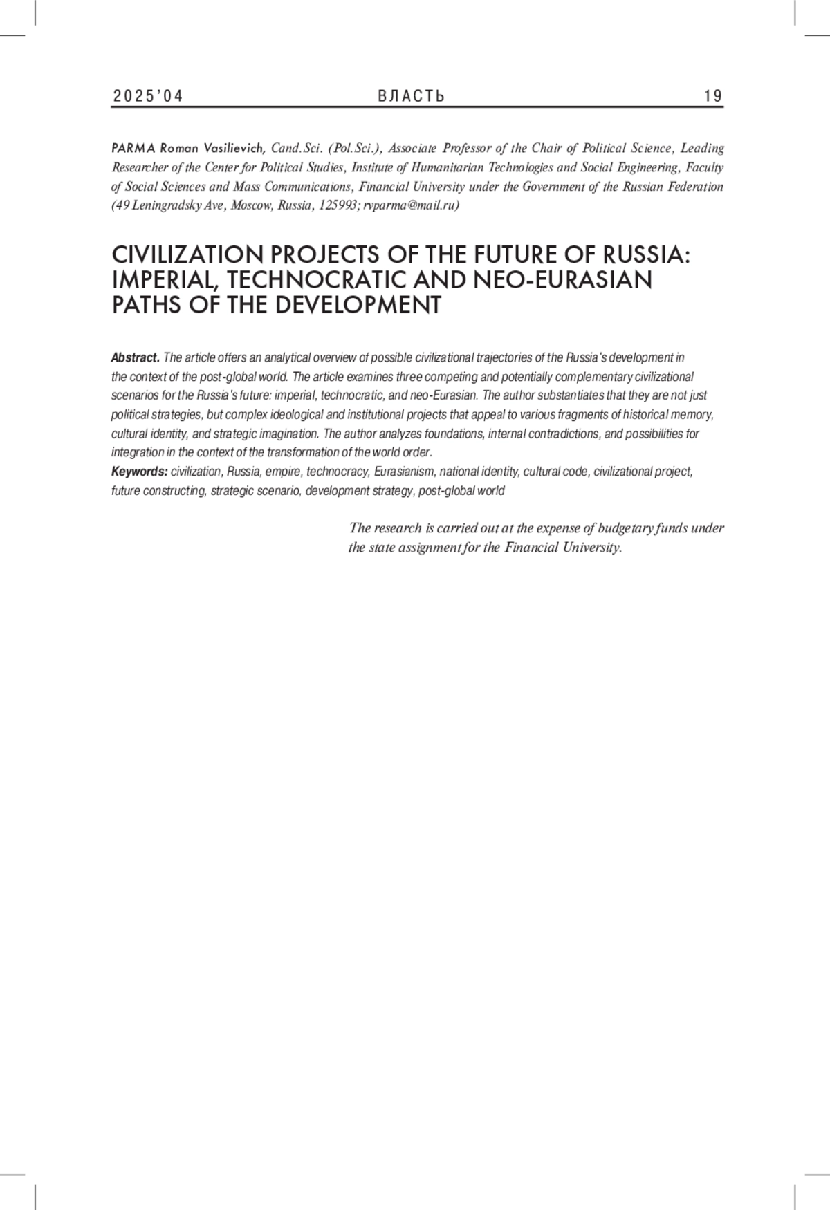 ПАРМА Р. В. ЦИВИЛИЗАЦИОННЫЕ ПРОЕКТЫ БУДУЩЕГО РОССИИ: ИМПЕРСКИЙ, ТЕХНОКРАТИЧЕСКИЙ И НЕОЕВРАЗИЙСКИЙ ПУТИ РАЗВИТИЯ // ВЛАСТЬ. 2025. ТОМ 33 № 4