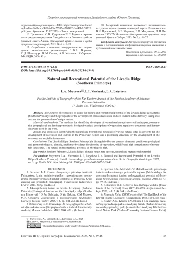 12. Леусов А. Е., Малюгин А. В., Сазыкин А. М. Особенности и перспективы рекреационного освоения Ливадийского хребта II Записки Общества изучения Амурского края, 2020, т XLVI, с. 63-68.