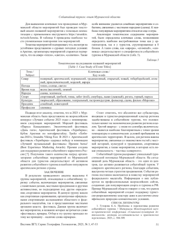 Целью является проведение анализа событийных мероприятий с точки зрения их перспектив развития туристической отрасли и экономического благосостояния арктического региона (на примере Мурманской области). Материалы и методы. Составлена база данных из планируемых к проведению в 2024 г событий в Мурманской области, размещенных на сайте «51 событие» с помощью ручного веб-скрейпинга. Полученные данные были обобщены и проанализированы с помощью статистических методов, дополнены данными из официальных средств массовой информации Мурманской области. На завершающем этапе был проведен текстовый анализ названий мероприятий. Результаты и обсуждение. В результате анализа были выделены: во-первых, группы мероприятий, относящихся к событийному туризму, во-вторых, распределение событий с географической точки зрения и по дате их проведения, в-третьих, определено тематическое содержание мероприятий. Ценность и новизна полученных результатов заключаются в поиске перспективных направлений развития туристической отрасли и экономического благосостояния арктического региона (на примере Мурманской области). Заключение. К ключевым особенностям практики организации событий в регионе является то, что органы местного самоуправления активно реализуют туристский потенциал Мурманской области, события в регионе выступают катализатором развития внутреннего туризма, способствуя экономическому развитию малых населенных пунктов, а также служат для привлечения новых кадров в регион. Выводы могут быть масштабированы на другие регионы РФ при учёте местных особенностей.