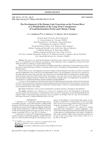 АНЦИФЕРОВА Г. А., КОЧЕТОВА Ж. Ю., РУСОВА Н. И., БОРИСОВА Л.Е. РАЗВИТИЕ ЭКОСИСТЕМЫ ОЗЕРА РАМЗА НА РЕКЕ ВОРОНА КАК ПРОЯВЛЕНИЕ ДОЛГОВРЕМЕННЫХ ПОСЛЕДСТВИЙ МЕЛИОРАТИВНЫХ РАБОТ И КЛИМАТИЧЕСКИХ ИЗМЕНЕНИЙ // ВЕСТНИК ВОРОНЕЖСКОГО ГОСУДАРСТВЕННОГО УНИВЕРСИТЕТА. СЕРИЯ: ГЕОГРАФИЯ. ГЕОЭКОЛОГИЯ. 2025. № 3