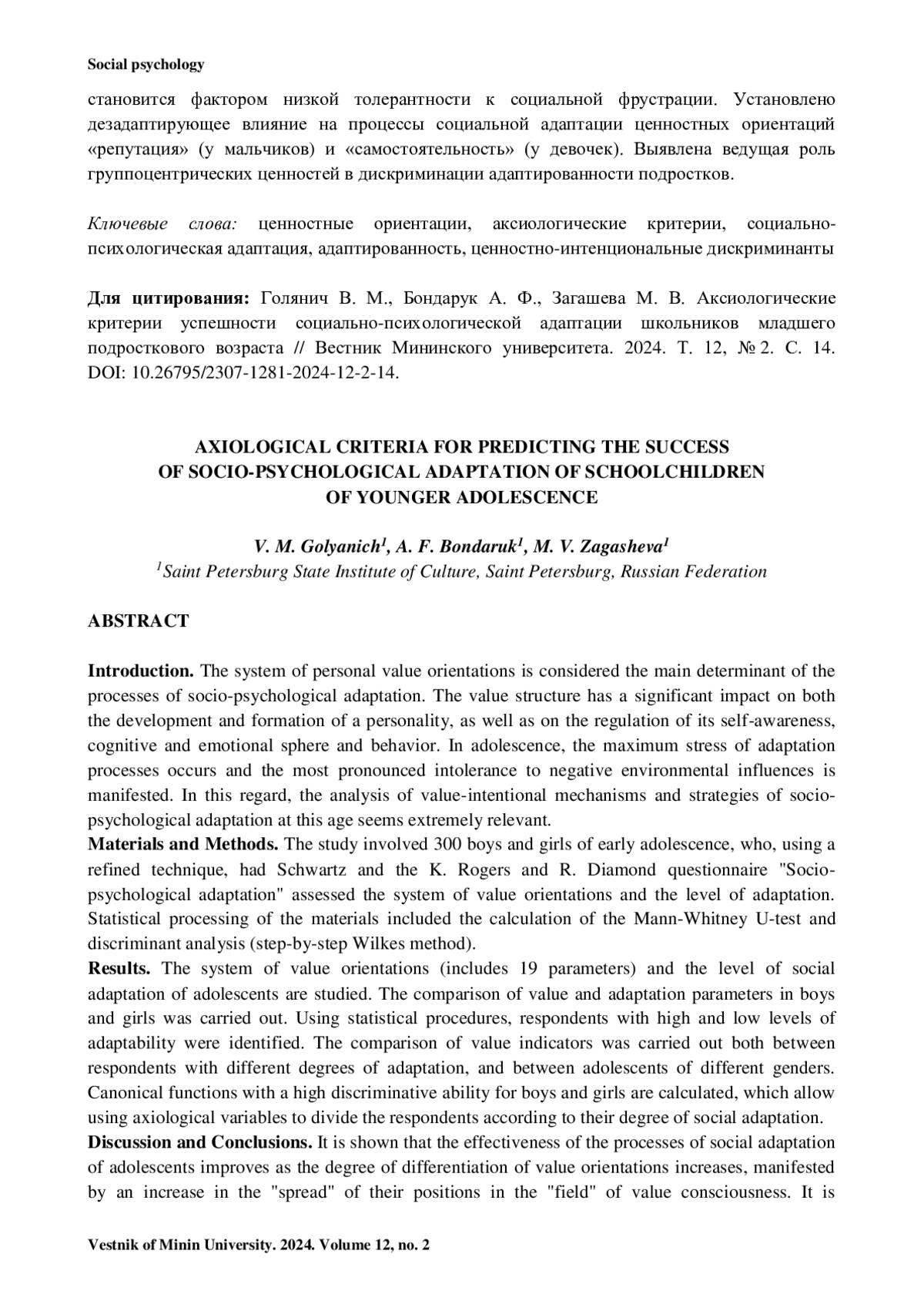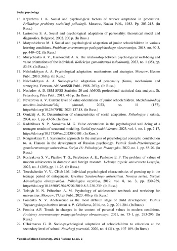 ГОЛЯНИЧ В. М., БОНДАРУК А. Ф., ЗАГАШЕВА М. В. АКСИОЛОГИЧЕСКИЕ КРИТЕРИИ УСПЕШНОСТИ СОЦИАЛЬНО-ПСИХОЛОГИЧЕСКОЙ АДАПТАЦИИ ШКОЛЬНИКОВ МЛАДШЕГО ПОДРОСТКОВОГО ВОЗРАСТА // ВЕСТНИК МИНИНСКОГО УНИВЕРСИТЕТА. 2024. ТОМ 12, № 2