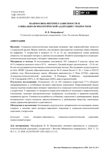Введение. Социально-психологическая адаптация возникает при взаимодействии личности с социальной средой. Можно заметить, как интернет-пространство подменяет живое общение на цифровое. У подростков в возрасте от 14 до 16 лет увеличиваются темпы развития личности, что вызывает интерес к данному исследованию. В работе анализируется социально-психологическая адаптация у интернет-зависимых подростков.