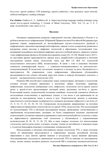 Введение. Интенсификация и техническое развитие страны, пандемия COVID-19 и постковидный этап вызвали активную интеграцию цифровых средств в образовательный процесс, что привело к новому этапу развития современной российской системы образования – её цифровизации. В настоящее время разрабатываются и внедряются в обучение иностранным языкам новые цифровые технологии, в т. ч. технологии искусственного интеллекта. Данная статья рассматривает применение технологии text-to-speech с использованием нейросетей для совершенствования техники чтения на английском и немецком языках студентов языковых и неязыковых специальностей. Навыки чтения вслух на иностранном языке можно совершенствовать с помощью синтезаторов речи Natural Reader и TTSFree, которые студенты могут использовать в автономной работе. В силу издания в 2018 года нового ФГОС ВПО, приведшего к уменьшению объема аудиторной работы со студентами, увеличению объема самостоятельной работы студентов и к увеличению наполняемости учебных групп, практическое использование синтезаторов речи на занятиях по иностранному языку представляется актуальным и важным.