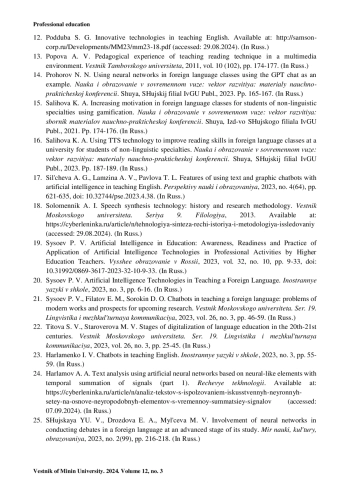 21. Сысоев П. В., Филатов Е. М., Сорокин Д. О. Чат-боты в обучении иностранному языку: проблематика современных работ и перспективы предстоящих исследований // Вестник Московского университета. Сер. 19. Лингвистика и межкультурная коммуникация. 2023. Т. 26, № 3. С. 46-59.