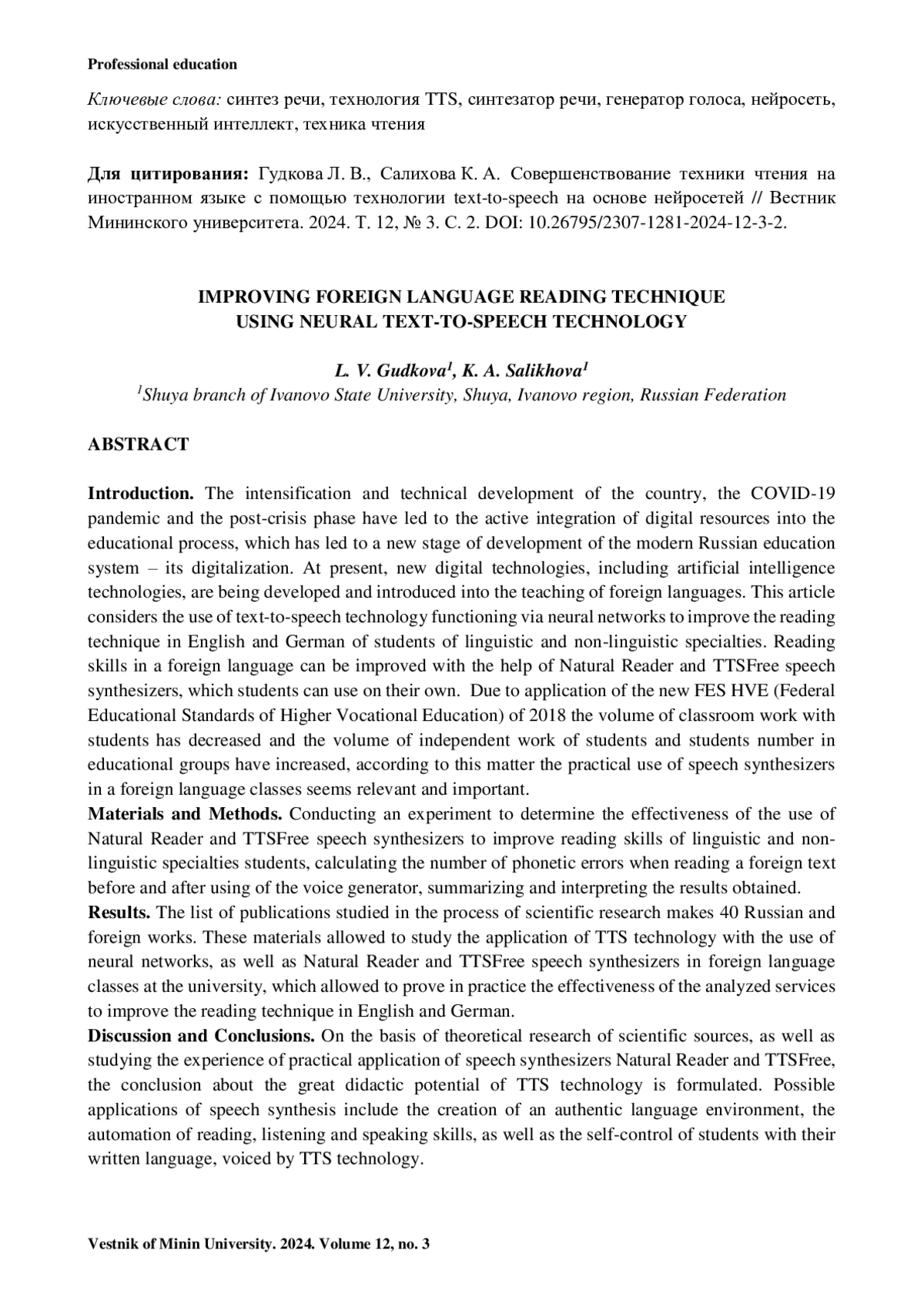 Результаты исследования. Список публикаций, изученных в процессе проведения научного исследования, составляет 40 российских и зарубежных работ. Данные материалы позволили изучить применение технологии text-to-speech с использованием нейросетей, а также синтезаторов речи Natural Reader и TTSFree на занятиях по иностранному языку в вузе, что позволило доказать на практике эффективность применения анализируемых сервисов для совершенствования техники чтения на английском и немецком языках.