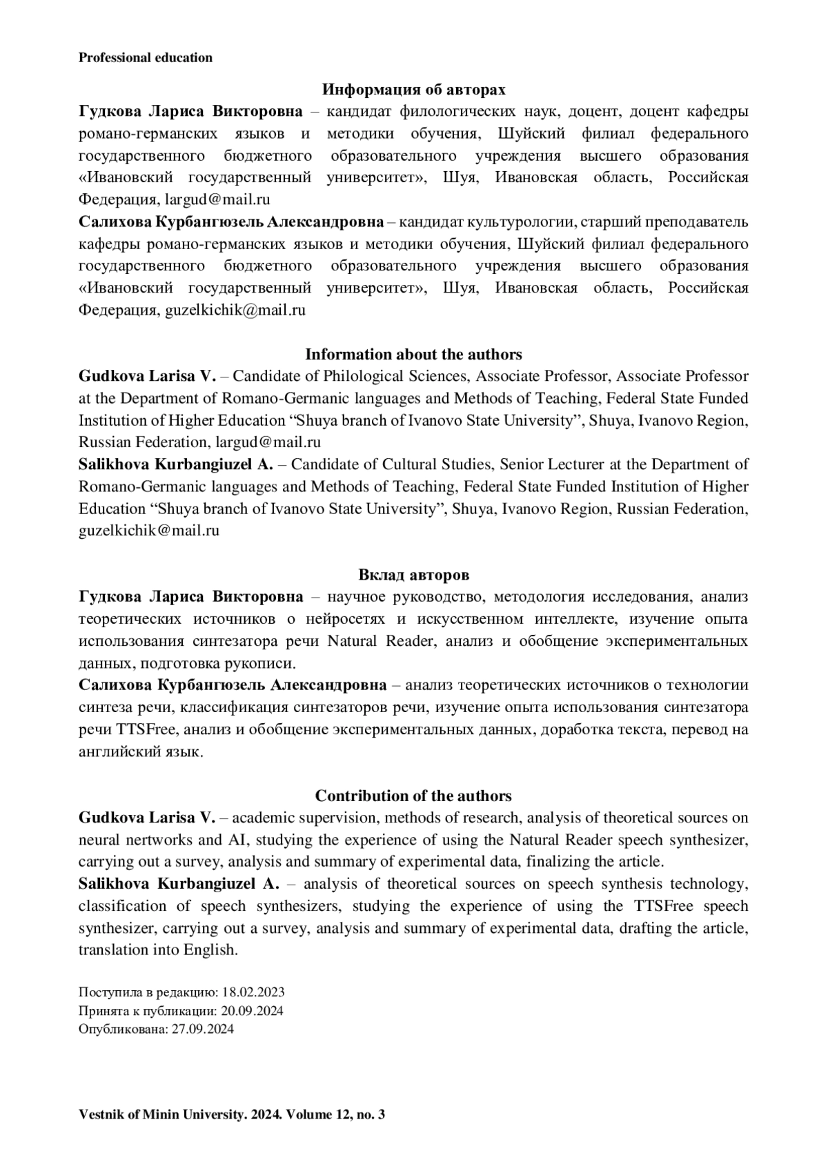 3. Гудкова Л. В. Синтезатор речи NaturalReader как средство совершенствования техники чтения на немецком языке // Наука и образование в современном вузе: вектор развития : материалы научно-практической конференции. Шуя: Шуйский филиал ИвГУ, 2023. С. 259-261.