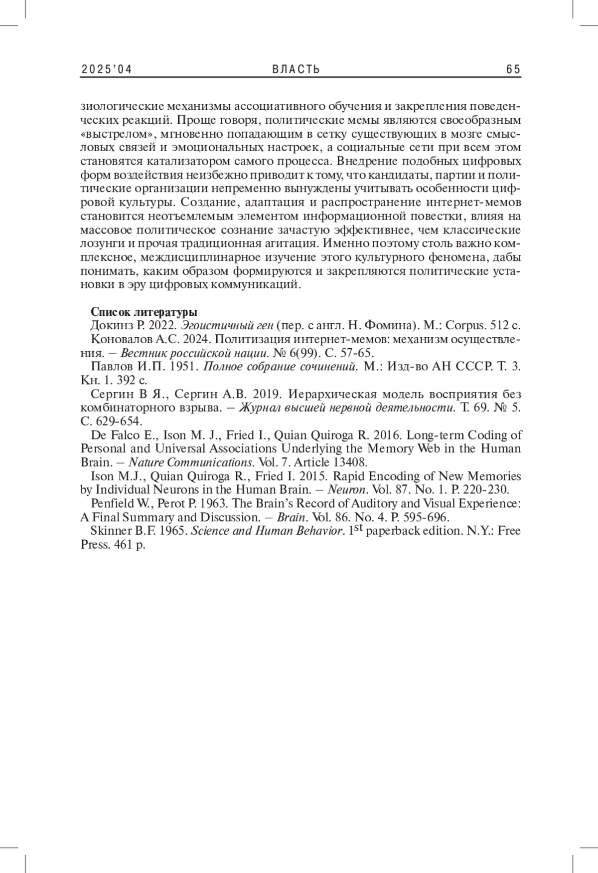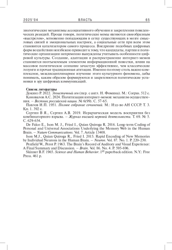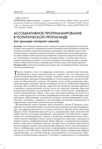 2. Коновалов А.С. 2024. Политизация интернет-мемов: механизм осуществления. - Вестник российской нации. № 6(99). С. 57-65. EDN: NHAFNJ
