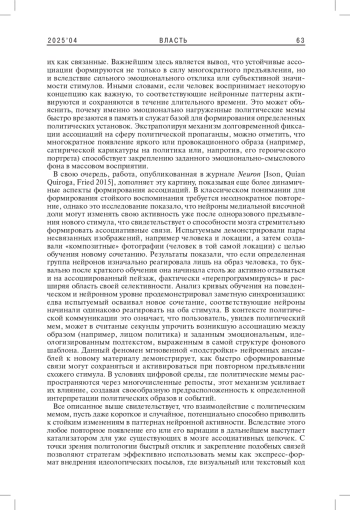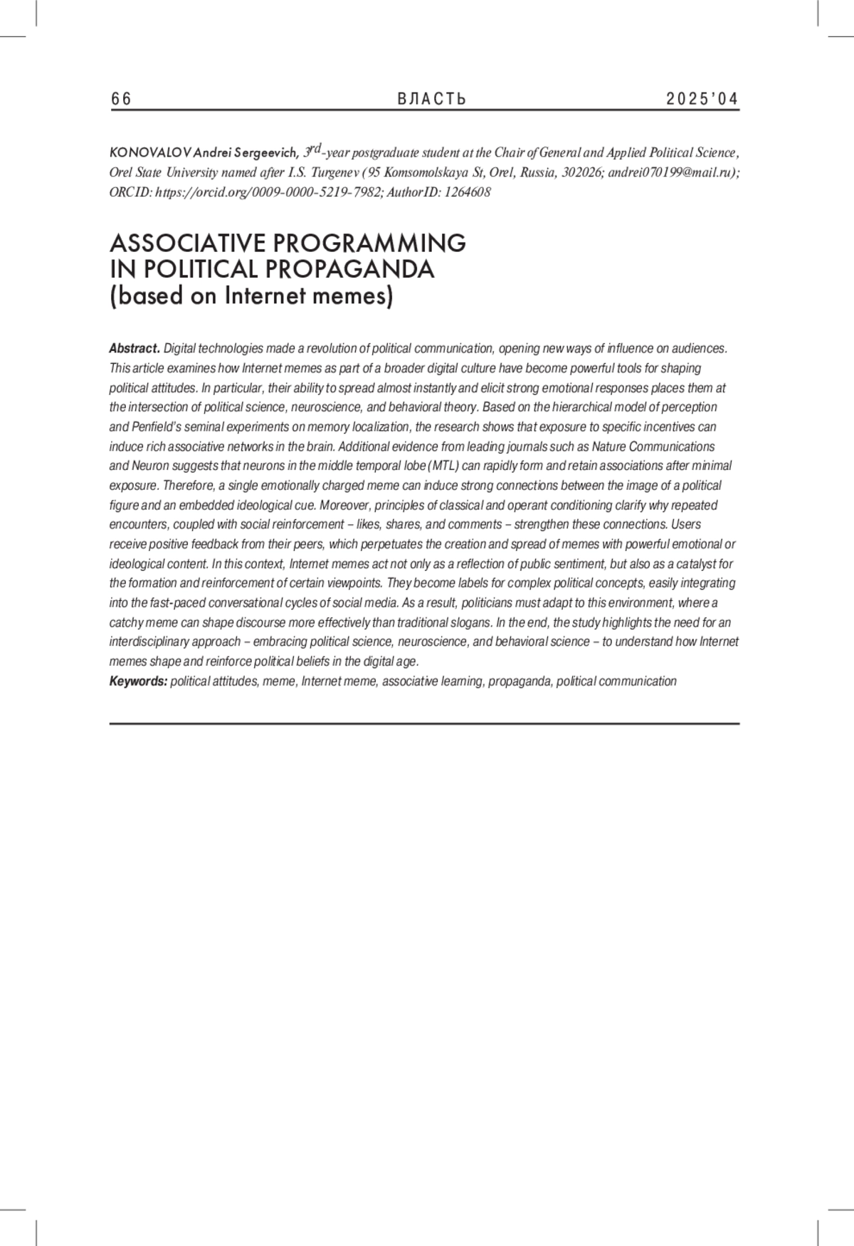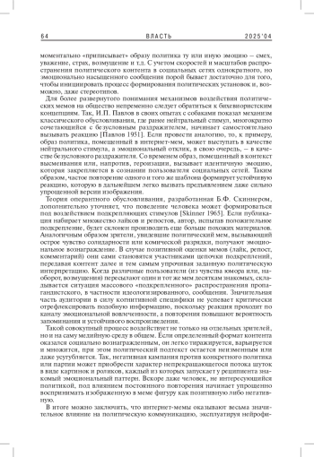 Статья посвящена анализу интернет-мемов как инструмента формирования политических установок. Автор опирается на нейрофизиологические и бихевиористские исследования, объясняющие механизмы восприятия и закрепления информации; рассматривает, каким образом интернет-мемы способны вызывать у аудитории устойчивые ассоциации с определенными политическими нарративами. Особое внимание в работе уделяется роли повторения и социального подкрепления (лайки, репосты). Таким образом, на основании всех данных автор демонстрирует, что интернет-мемы не просто отражают общественные настроения, но и активно конструируют политическую реальность, оказывая влияние на общественные дискурсы и формируя идеологические предпочтения целевой аудитории.