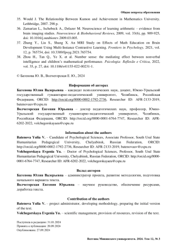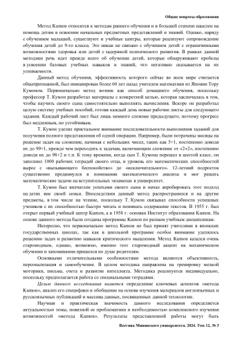 БАТЕНОВА Ю. В., ВОЛЧЕГОРСКАЯ Е. Ю. «МЕТОД KUMON» КАК СРЕДСТВО ОСВОЕНИЯ НАЧАЛЬНЫХ ПРЕДМЕТНЫХ ЗНАНИЙ У ДЕТЕЙ // ВЕСТНИК МИНИНСКОГО УНИВЕРСИТЕТА. 2024. ТОМ 12, № 3
