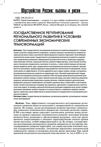 Статья: ГОСУДАРСТВЕННОЕ РЕГУЛИРОВАНИЕ РЕГИОНАЛЬНОГО РАЗВИТИЯ В УСЛОВИЯХ СОВРЕМЕННЫХ ЭКОНОМИЧЕСКИХ ТРАНСФОРМАЦИЙ (2025)