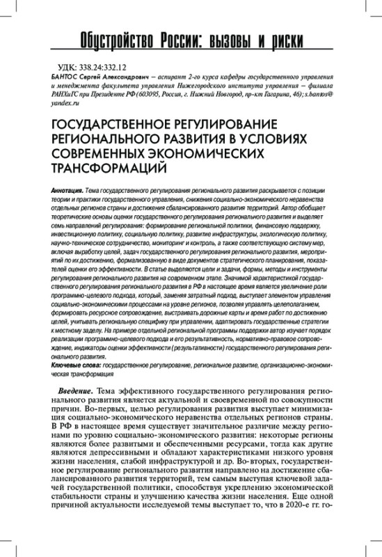БАНТОС С. А. ГОСУДАРСТВЕННОЕ РЕГУЛИРОВАНИЕ РЕГИОНАЛЬНОГО РАЗВИТИЯ В УСЛОВИЯХ СОВРЕМЕННЫХ ЭКОНОМИЧЕСКИХ ТРАНСФОРМАЦИЙ // ВЛАСТЬ. 2025. ТОМ 33 № 4