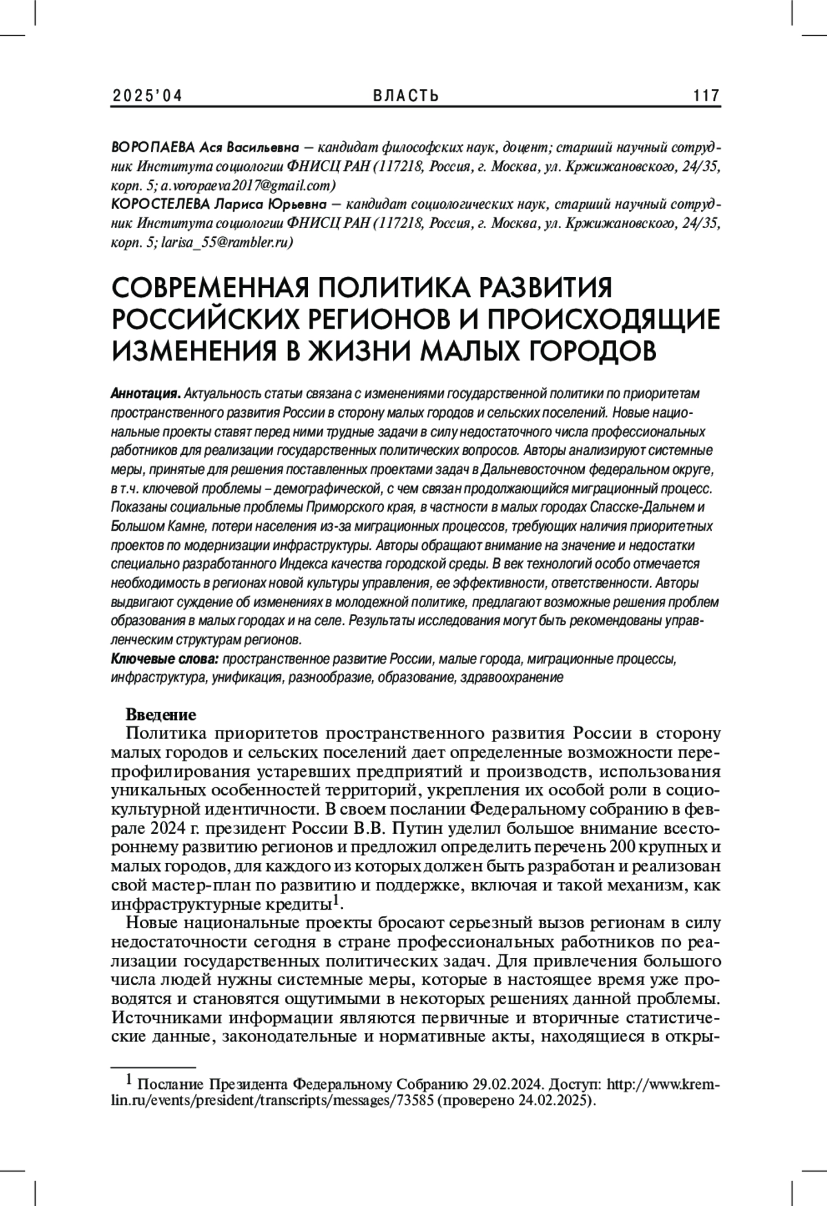 2. Воропаева А.В., Коростелева Л.Ю. 2024. Время нового взгляда на малые города. - ПОИСК. № 1(102). С. 51-62.