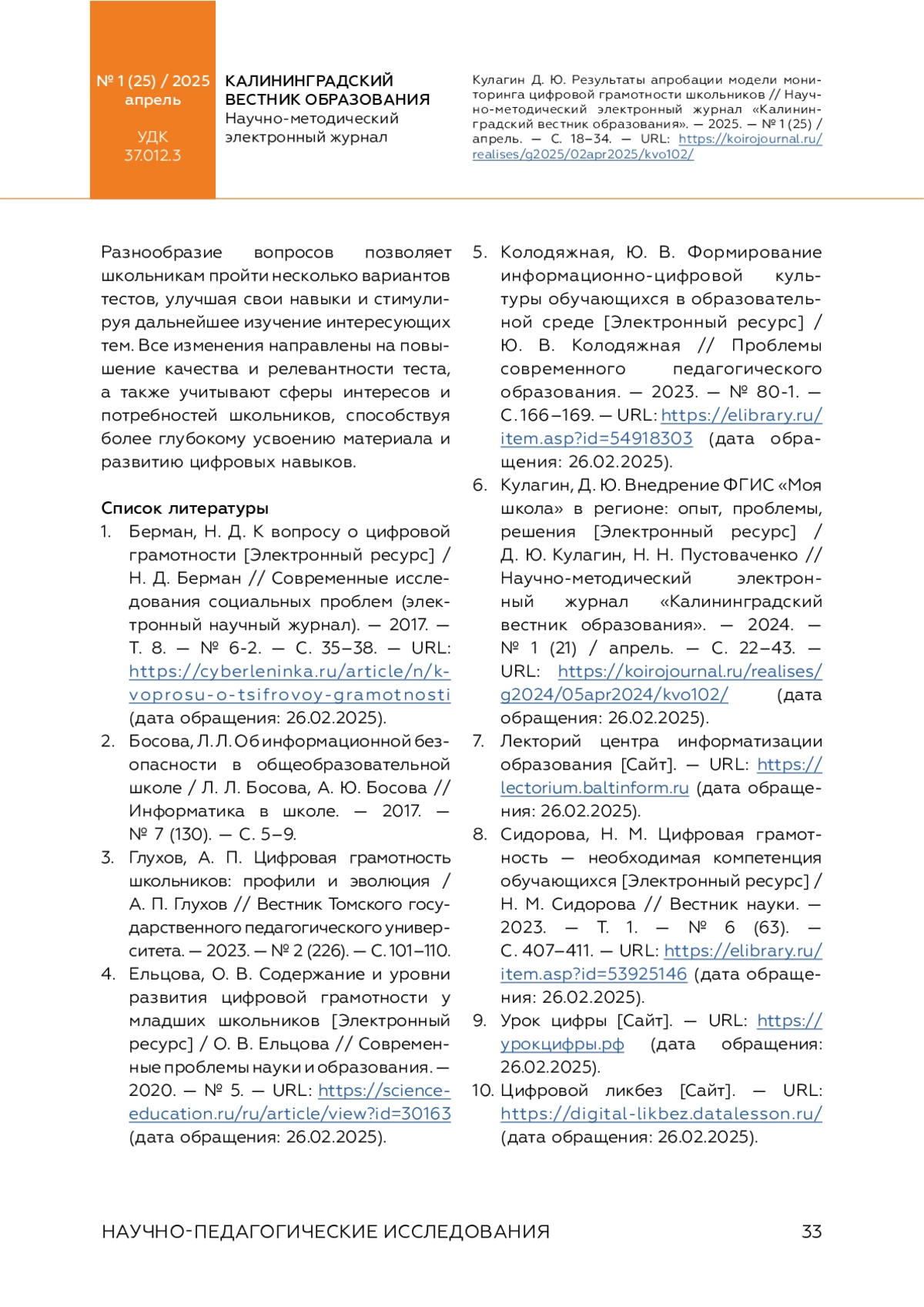 1. Берман, Н. Д. К вопросу о цифровой грамотности [Электронный ресурс] / Н. Д. Берман // Современные исследования социальных проблем (электронный научный журнал). - 2017. - Т. 8. - № 6-2. - С. 35-38. - URL: https://cyberleninka.ru/article/n/k-voprosu-o-tsifrovoy-gramotnosti (дата обращения: 26.02.2025).