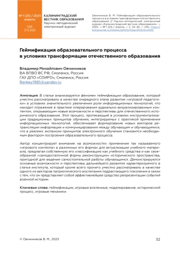 В статье анализируется феномен геймификации образования, который уместно рассматривать в качестве очередного этапа развития «игровой педагогики» в условиях значительного увеличения роли информационных технологий, что находит отражение в практике оперирования аудиально-визуализированным контентом, открывающим новые возможности и перспективы для отечественного исторического образования. Этот процесс, протекающий в условиях инструментализации традиционных принципов обучения, интегрируемых с практикой применения информационных технологий, обеспечивает формирование новых векторов ретрансляции информации и коммуницирования между обучающим и обучающимися, что в реалиях экспансии принципов электронного обучения становится необходимым фактором построения образовательного процесса.