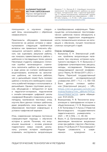 3. Ворошилова, Н. В. Технологии визуализации в преподавании истории и обществознания / Н. В. Ворошилова, А. В. Толмачева, Е. Н. Кукса // Известия Волгоградского государственного педагогического университета. - 2021. - № 2 (155). - С. 43-50.
