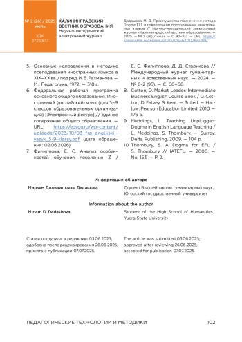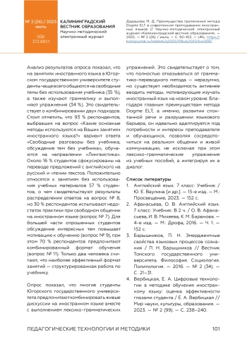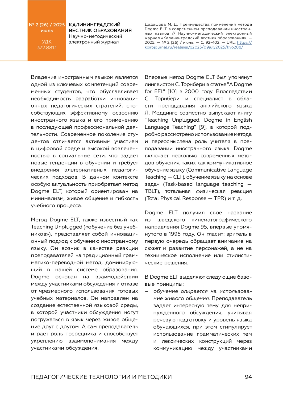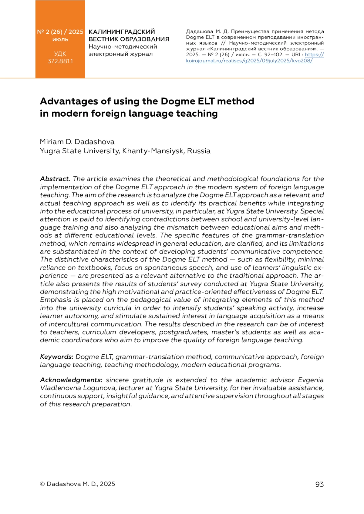ДАДАШОВА М. Д. ПРЕИМУЩЕСТВА ПРИМЕНЕНИЯ МЕТОДА DOGME ELT В СОВРЕМЕННОМ ПРЕПОДАВАНИИ ИНОСТРАННЫХ ЯЗЫКОВ // КАЛИНИНГРАДСКИЙ ВЕСТНИК ОБРАЗОВАНИЯ. 2025. № 2 (26)