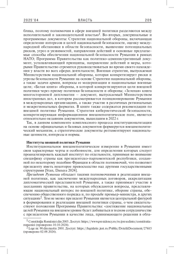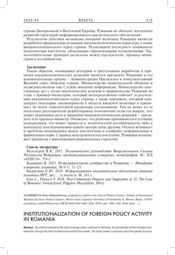Статья посвящена исследованию внешнеполитических институтов в Румынии, особенностям их формирования и взаимодействия через призму официальных и доктринальных документов. Автор делает вывод о специфичном устройстве процесса формирования и реализации внешней политики, особой роли института Президента, а также слабом аналитическом обеспечении внешнеполитической деятельности.