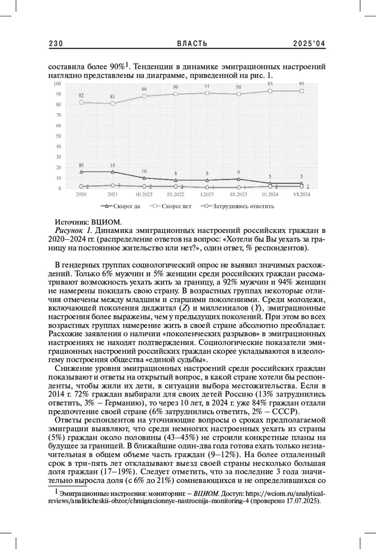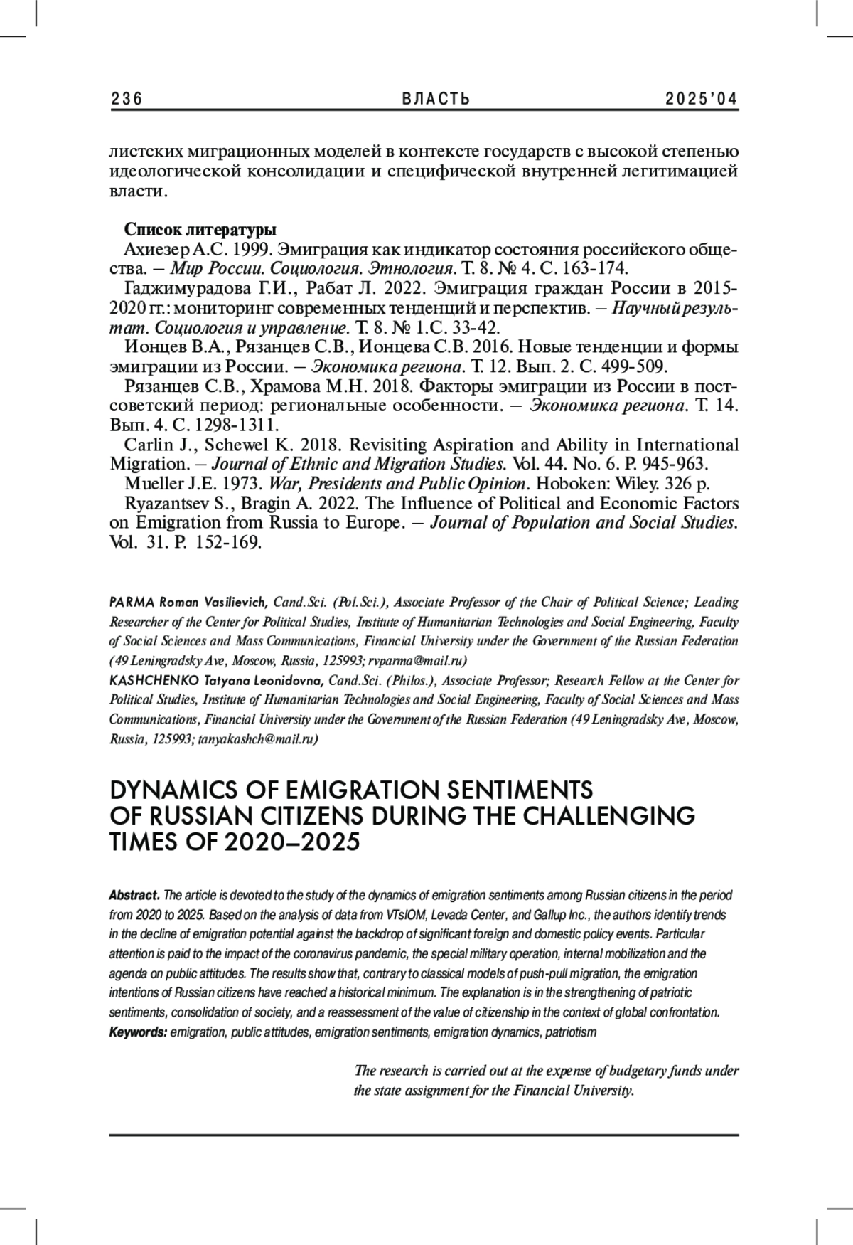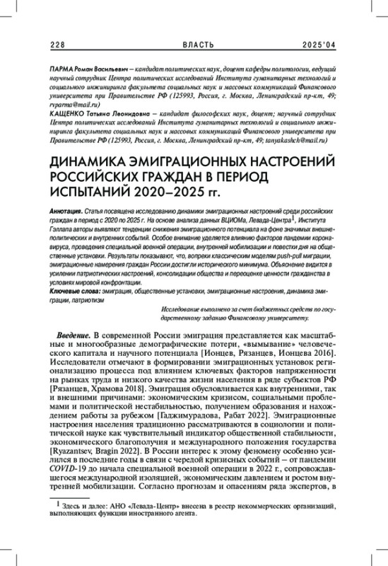ПАРМА Р. В., КАЩЕНКО Т. Л. ДИНАМИКА ЭМИГРАЦИОННЫХ НАСТРОЕНИЙ РОССИЙСКИХ ГРАЖДАН В ПЕРИОД ИСПЫТАНИЙ 2020-2025 ГГ. // ВЛАСТЬ. 2025. ТОМ 33 № 4