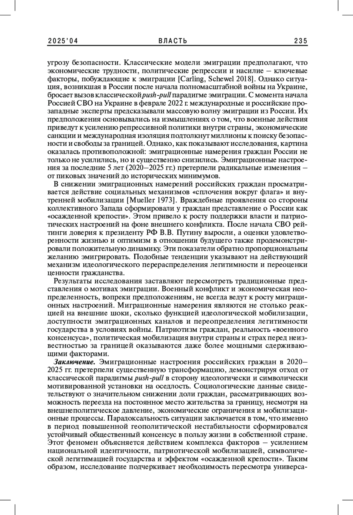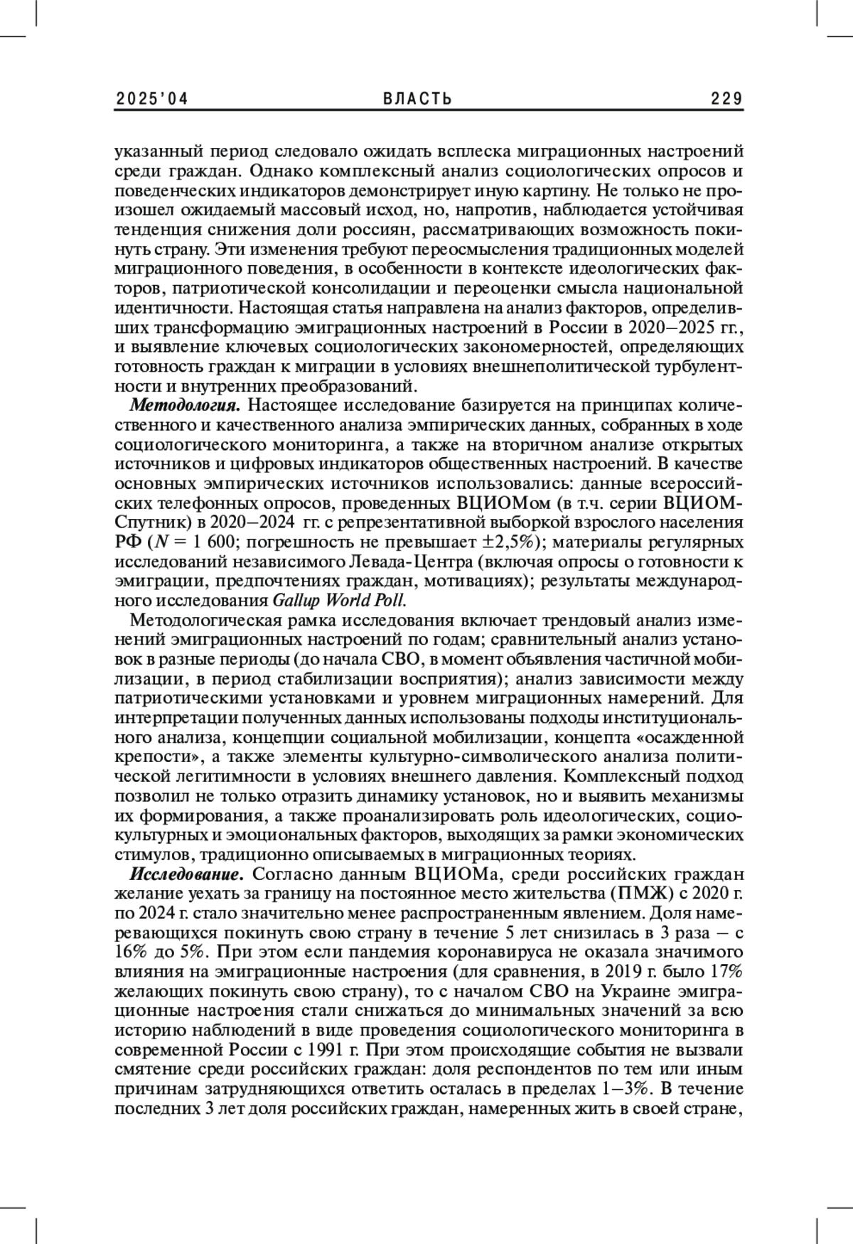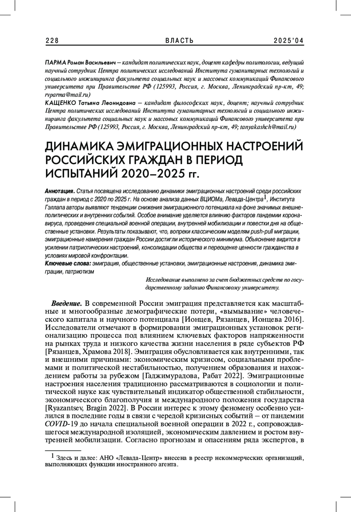 ПАРМА Р. В., КАЩЕНКО Т. Л. ДИНАМИКА ЭМИГРАЦИОННЫХ НАСТРОЕНИЙ РОССИЙСКИХ ГРАЖДАН В ПЕРИОД ИСПЫТАНИЙ 2020-2025 ГГ. // ВЛАСТЬ. 2025. ТОМ 33 № 4